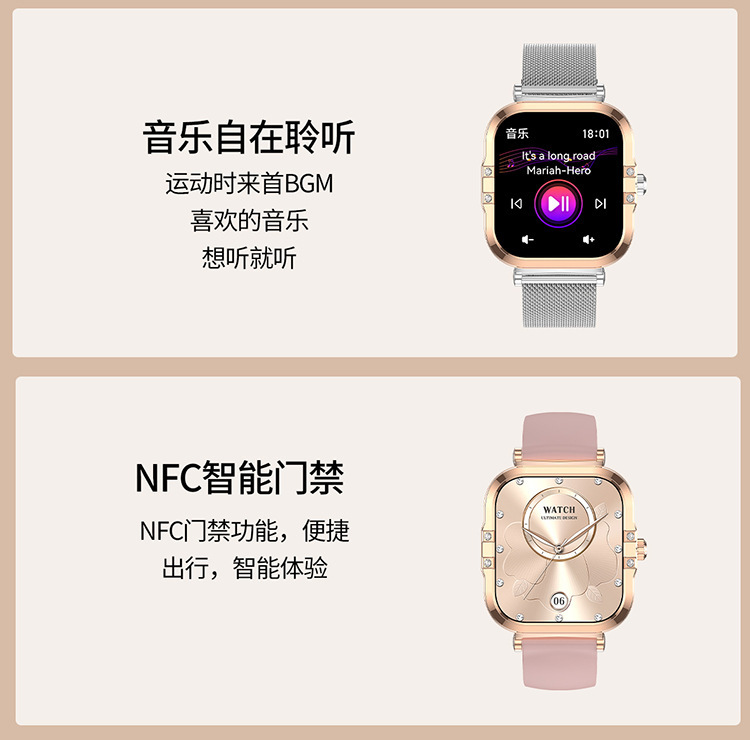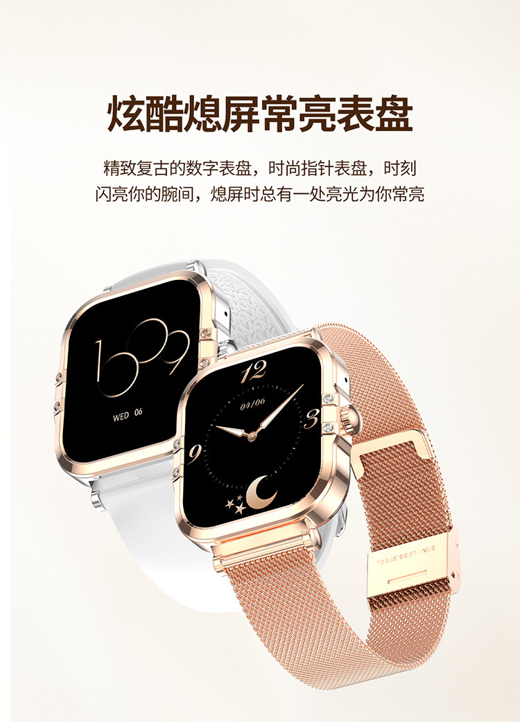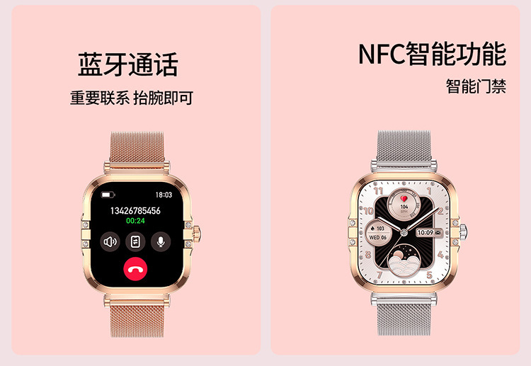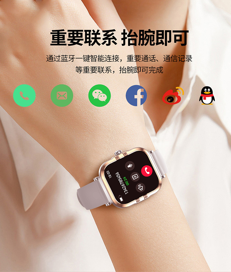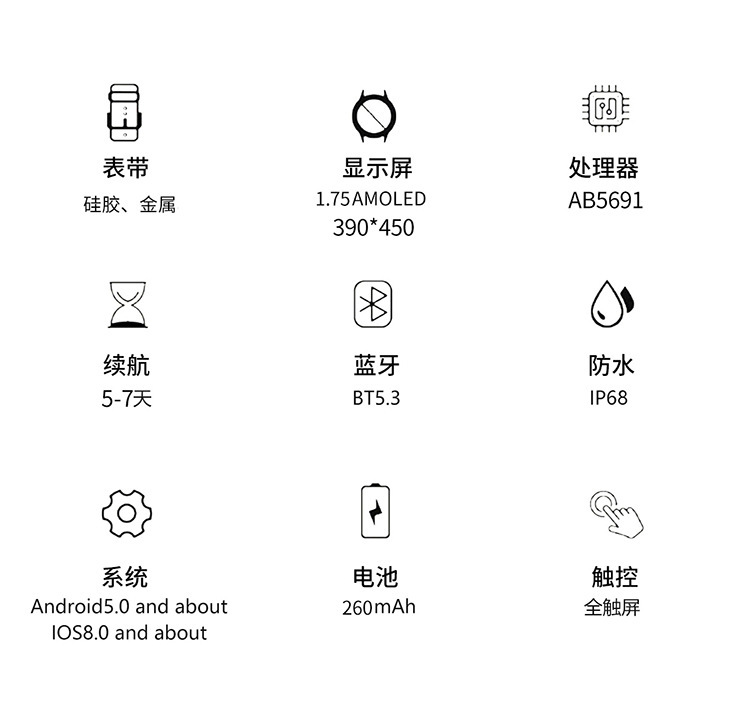 主要功能(Major function)蓝牙通话、语音控制、息屏常亮、NFC、支付宝离线支付、呼吸训练、日历、收款码,女性健康、SOS、计算器、密码解锁、自定义表盘、天气预报、音乐控制、计步、心率、睡眠、久坐、里程、血氧、血压、搜索、卡路里、消息推送硬件参数