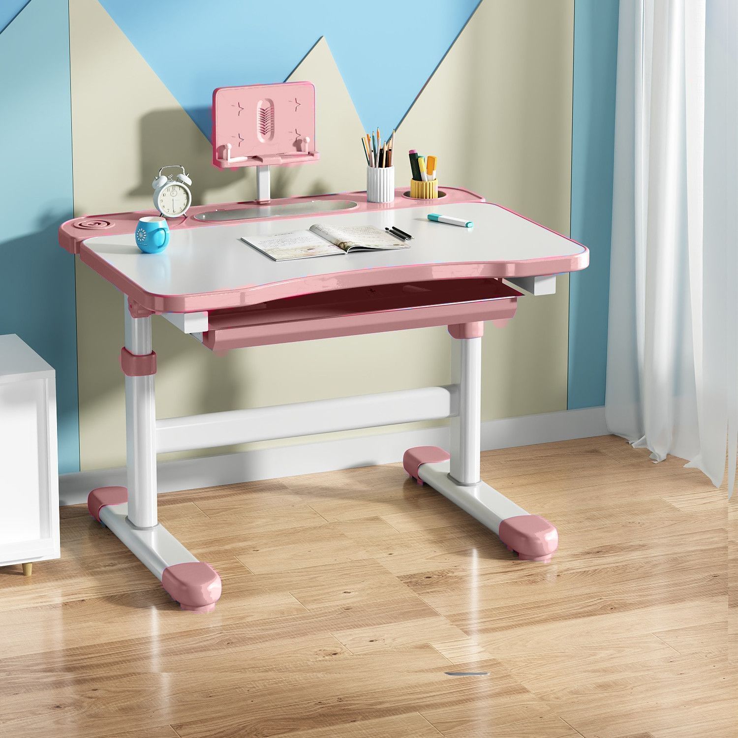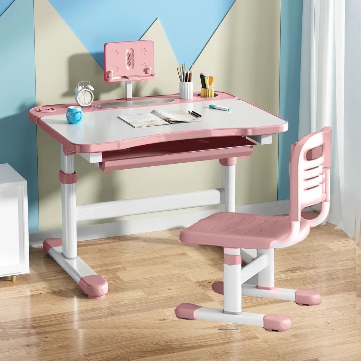 • 사쿠라 핑크 - 리프팅 및 리프팅 싱글 테이블 + 리프팅 및 리프팅 플라스틱 의자 - 무료 독서대 + 플러그인 눈 보호 램프
