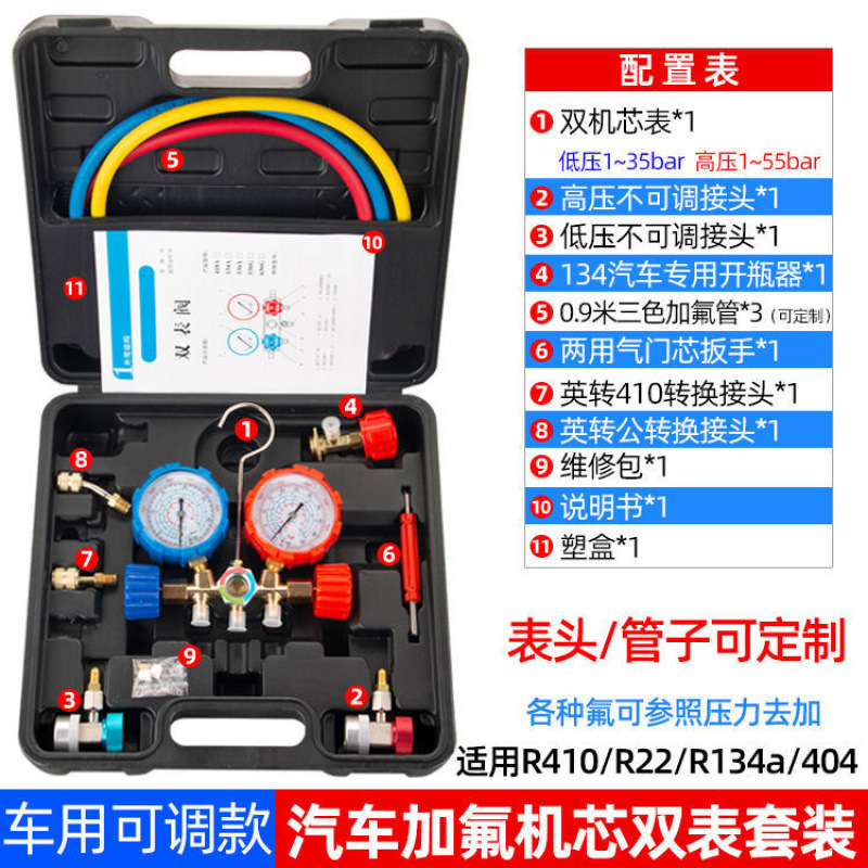 액체 추가 더블 게이지 에어컨 압력 게이지 가정용 에어컨 자동차 에어컨-불소 추가 미터 불소-추가 세트/냉매 미터