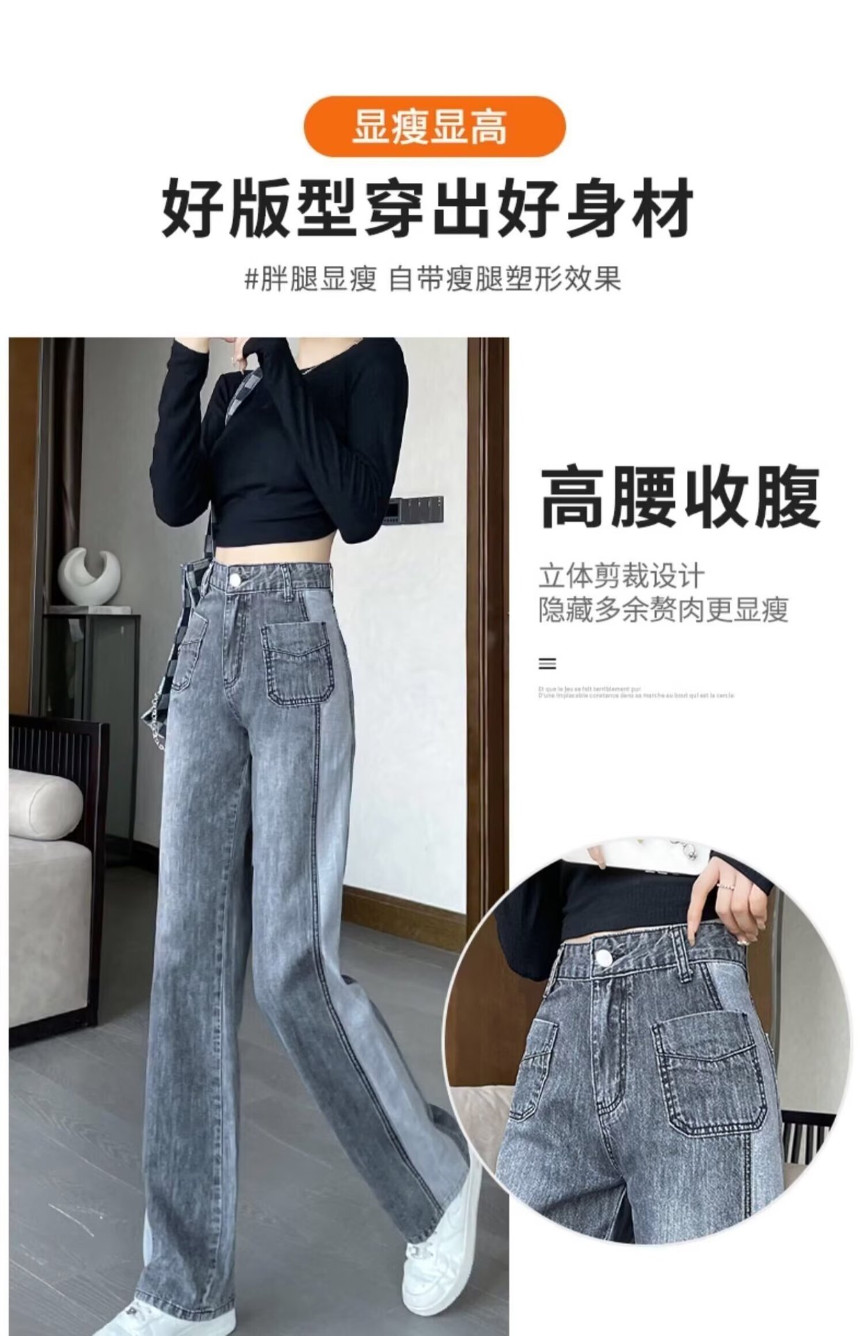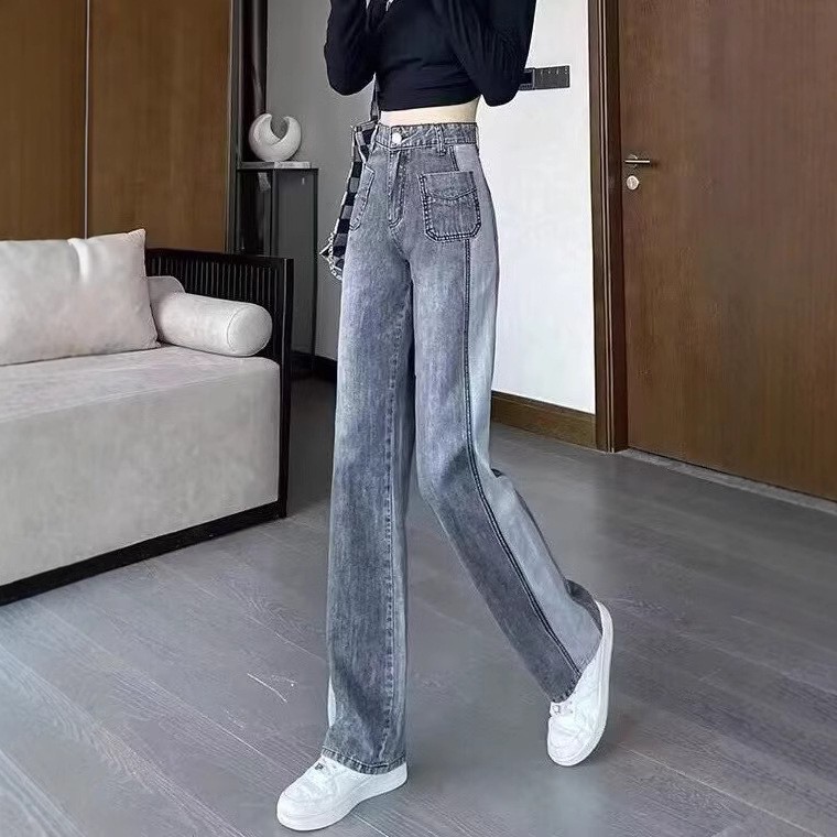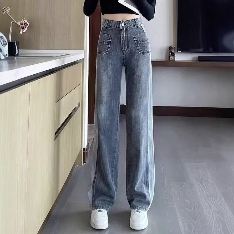 콘트라스트 컬러 레트로 하이 웨이스트 스트레이트 청바지 여성의 가을과 겨울 새로운 슬리밍 좁은 넓은 다리 플러스 사이즈 여성 의류스토어 가기