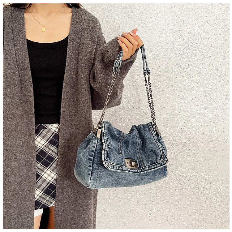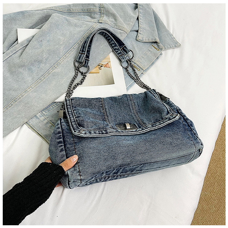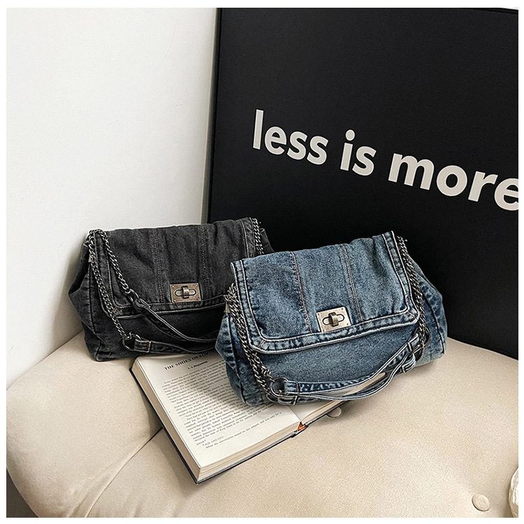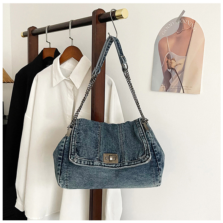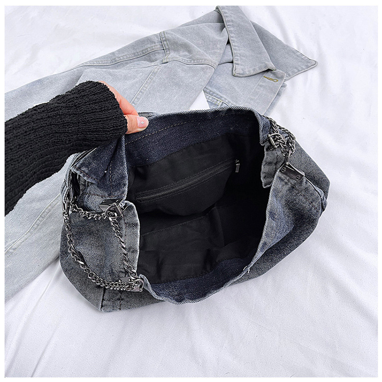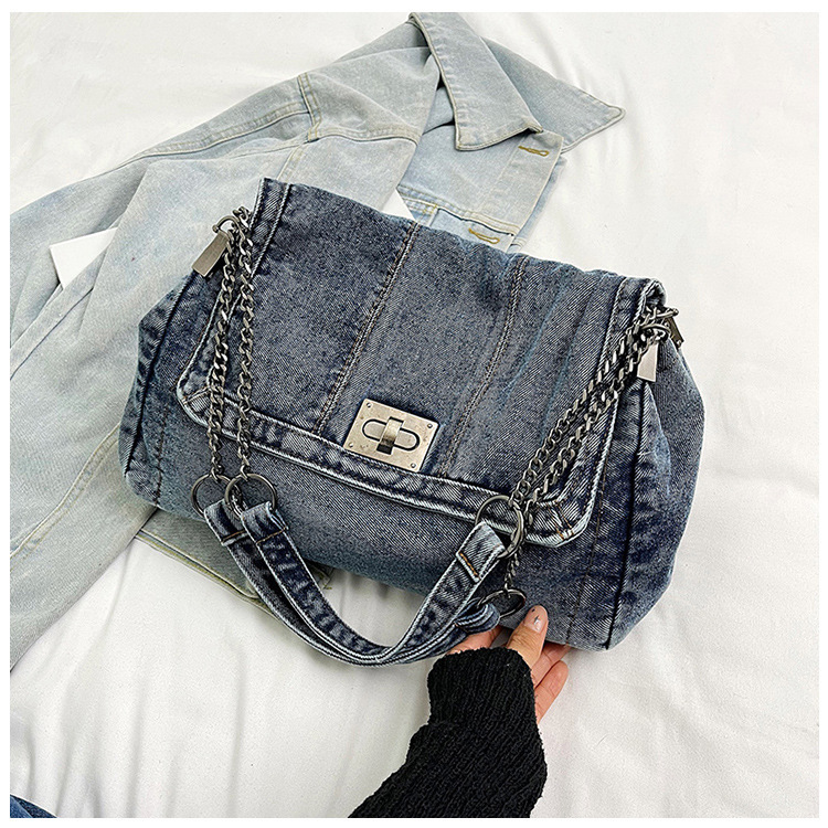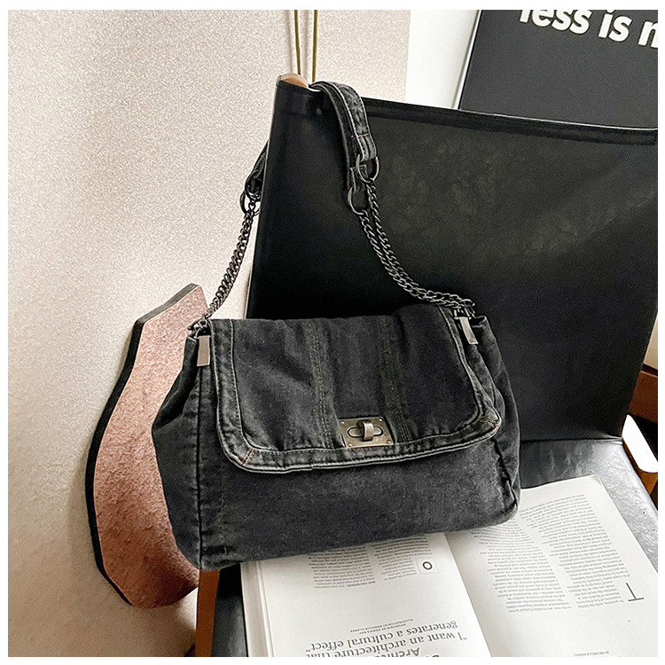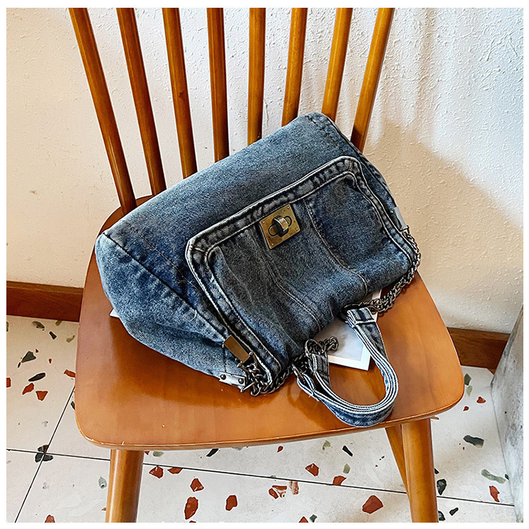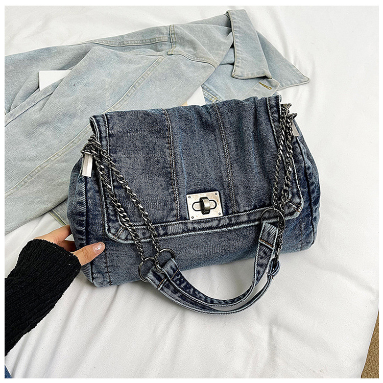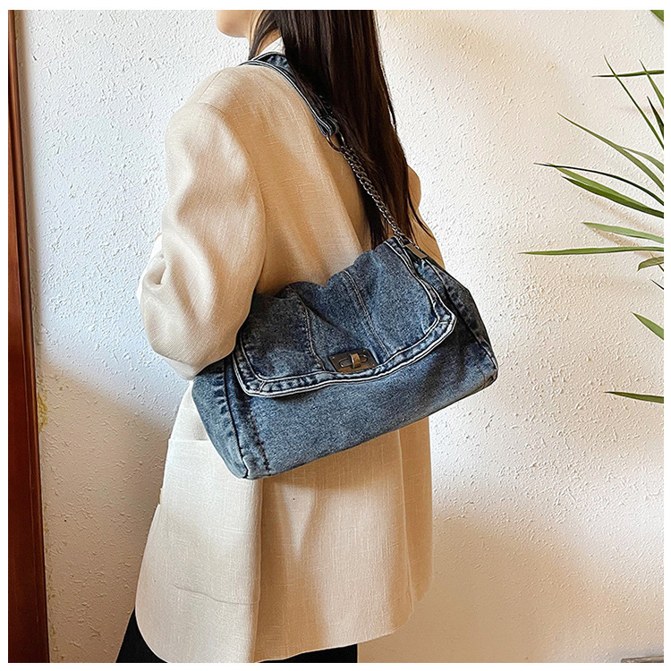 여성을위한 레트로 캐주얼 데님 가방 2024 새로운 하이 엔드 체인 숄더 백 대용량 통근 토트 백