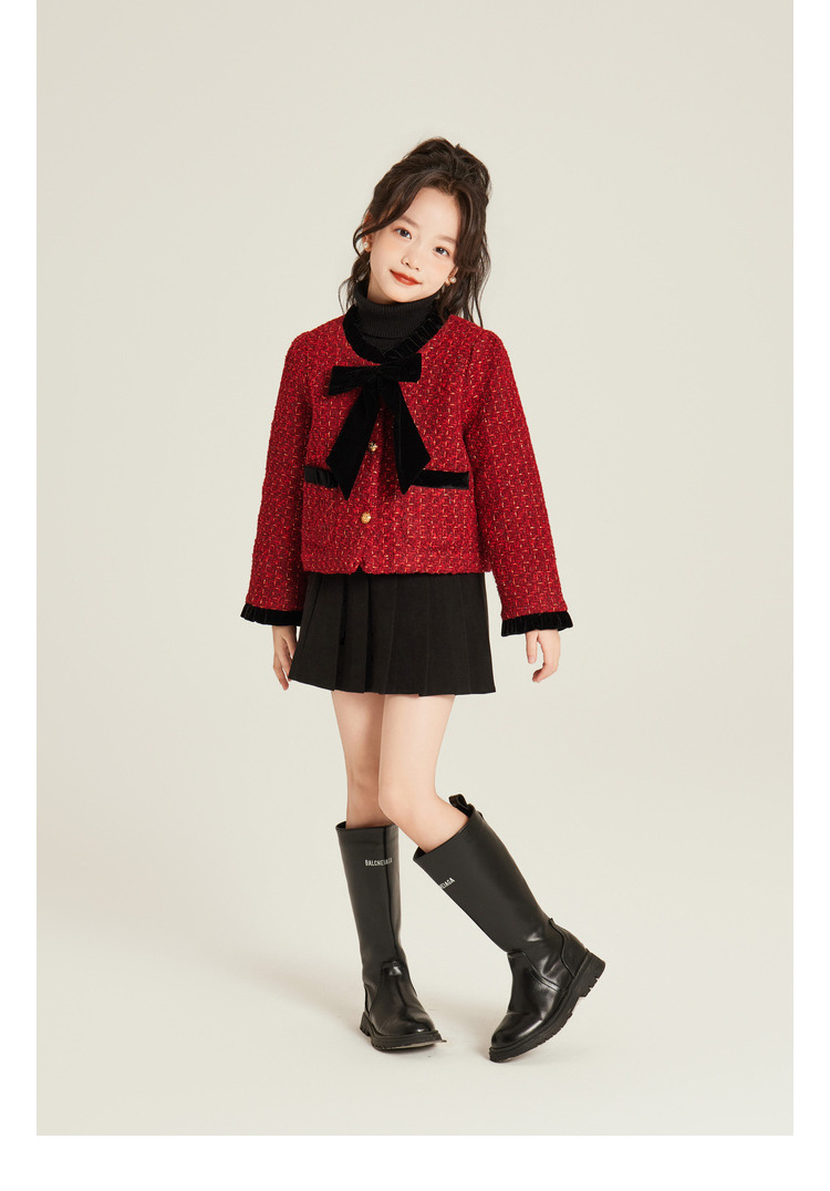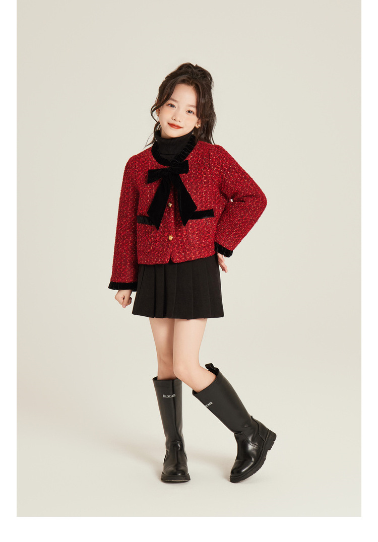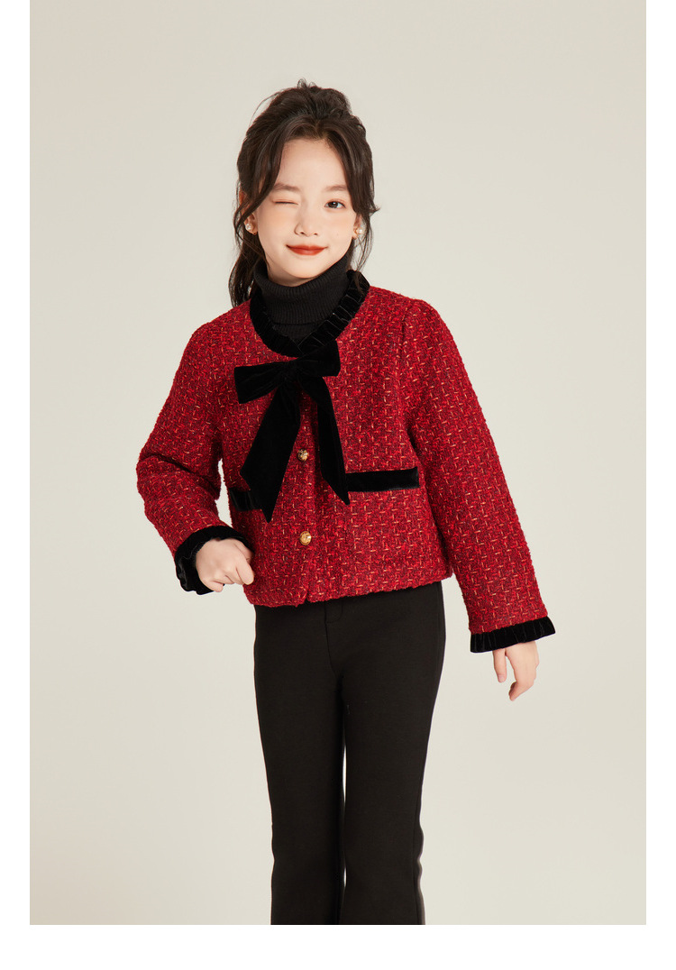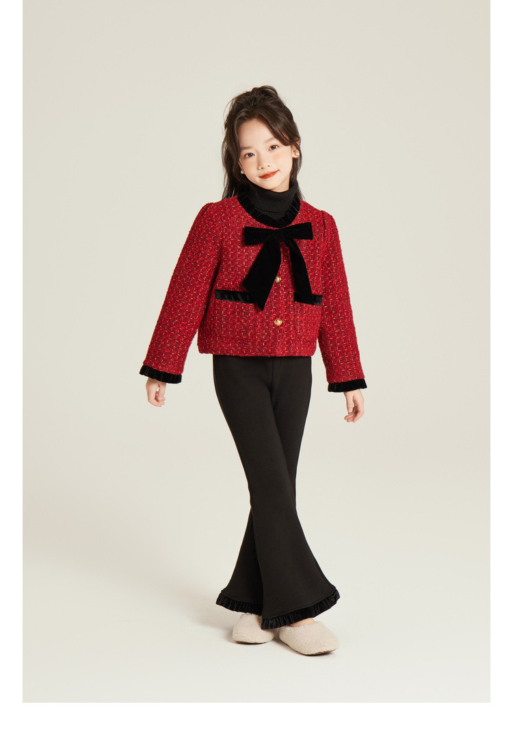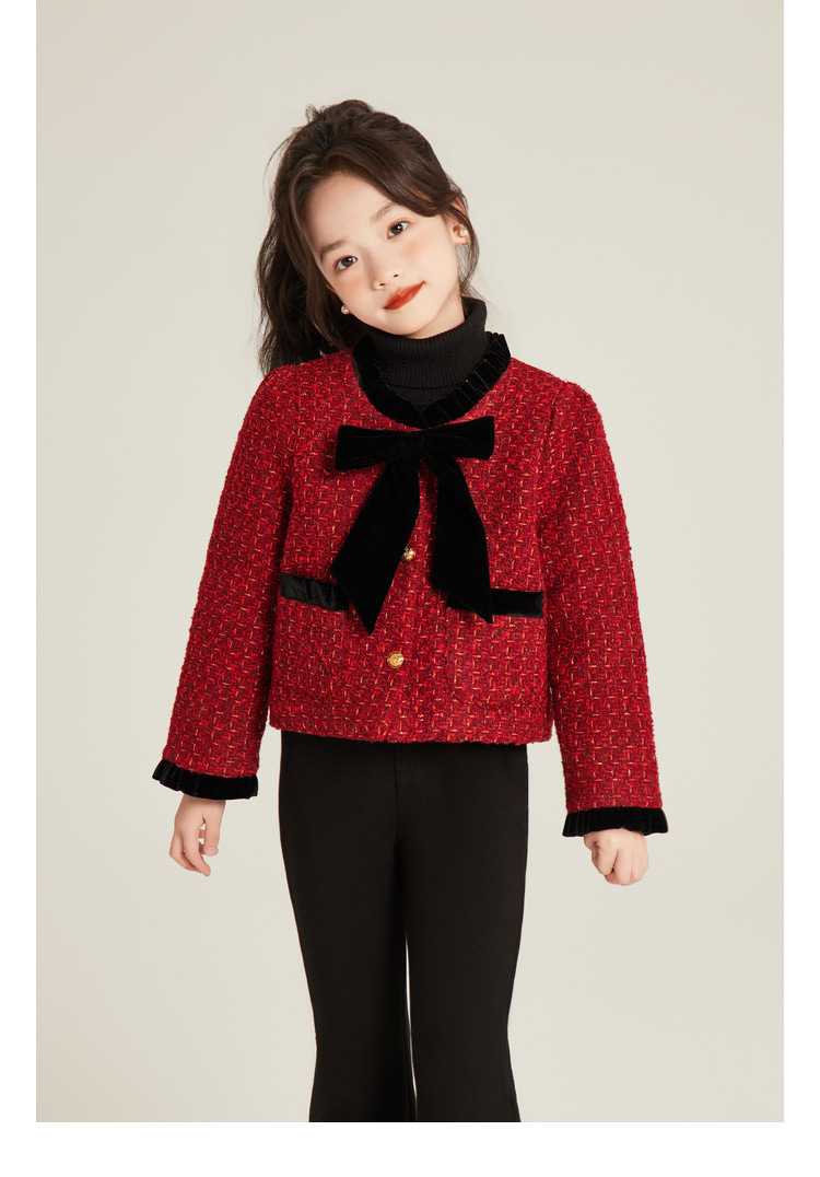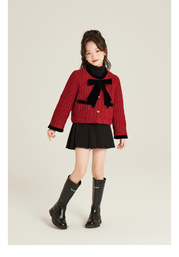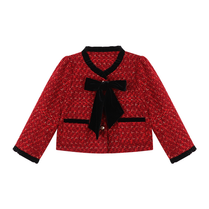Amybaby Girls 'Top Winter 2024 새로운 레드 샤넬 스타일 우아한 활 두꺼운 재킷