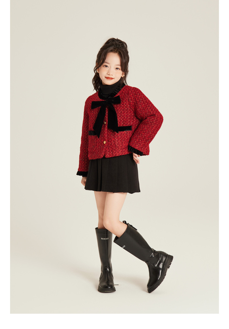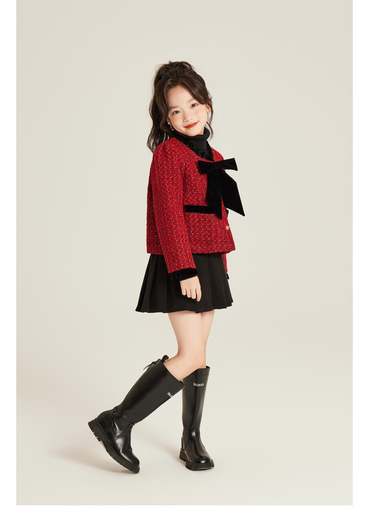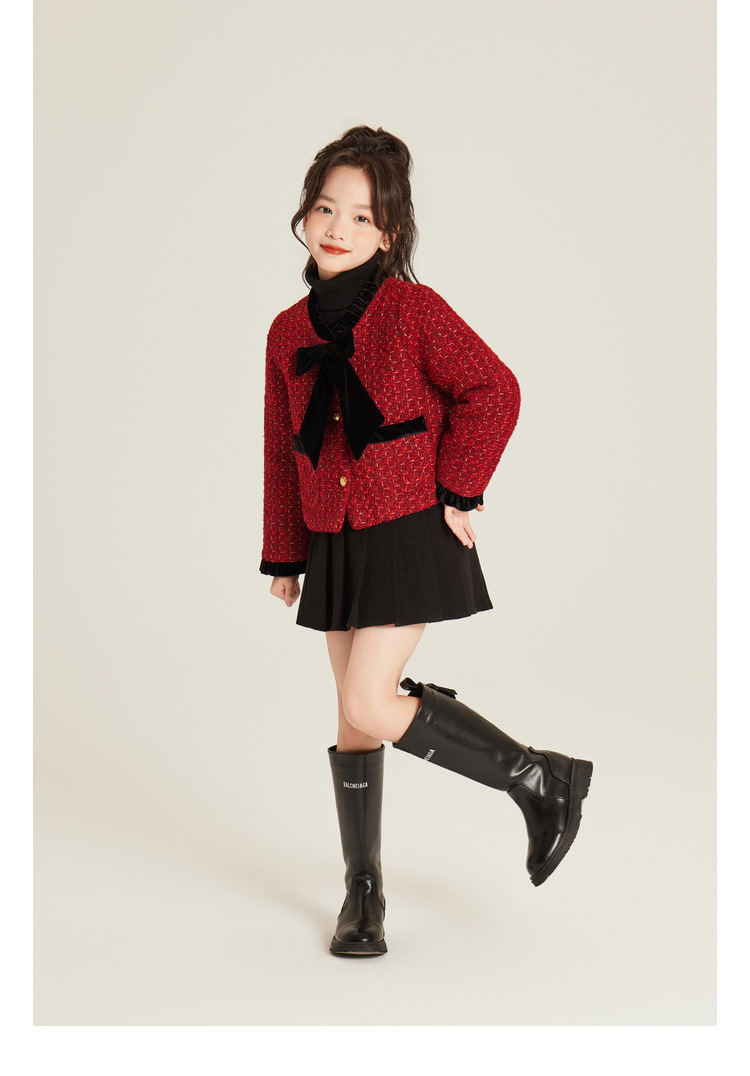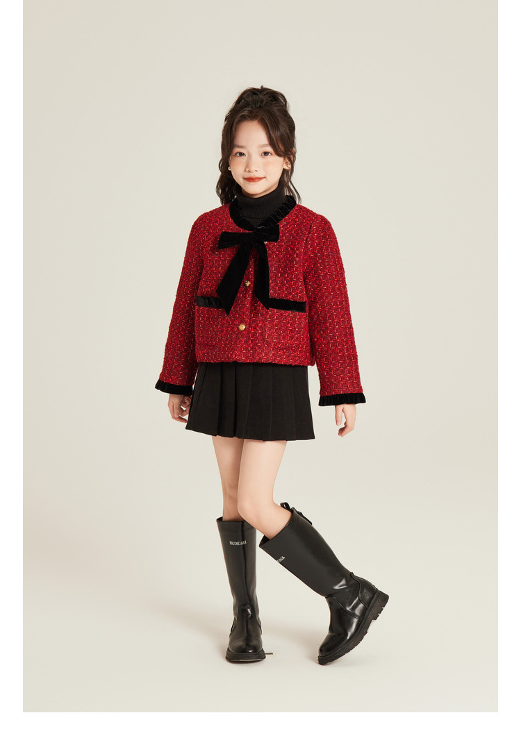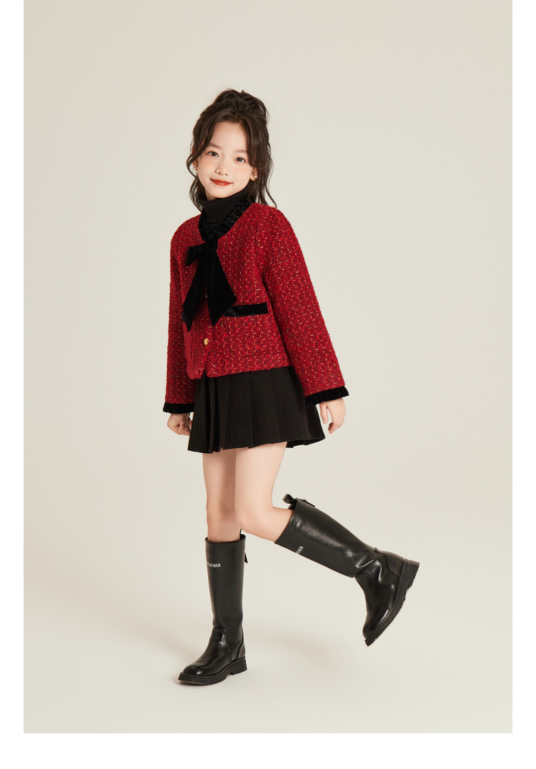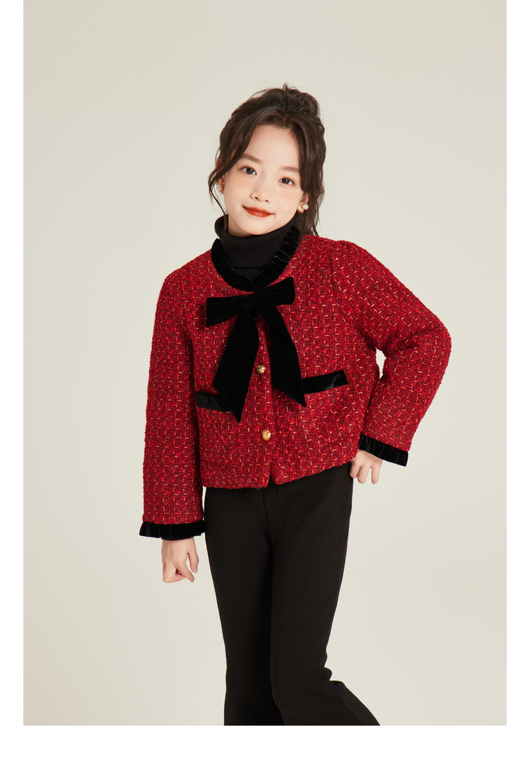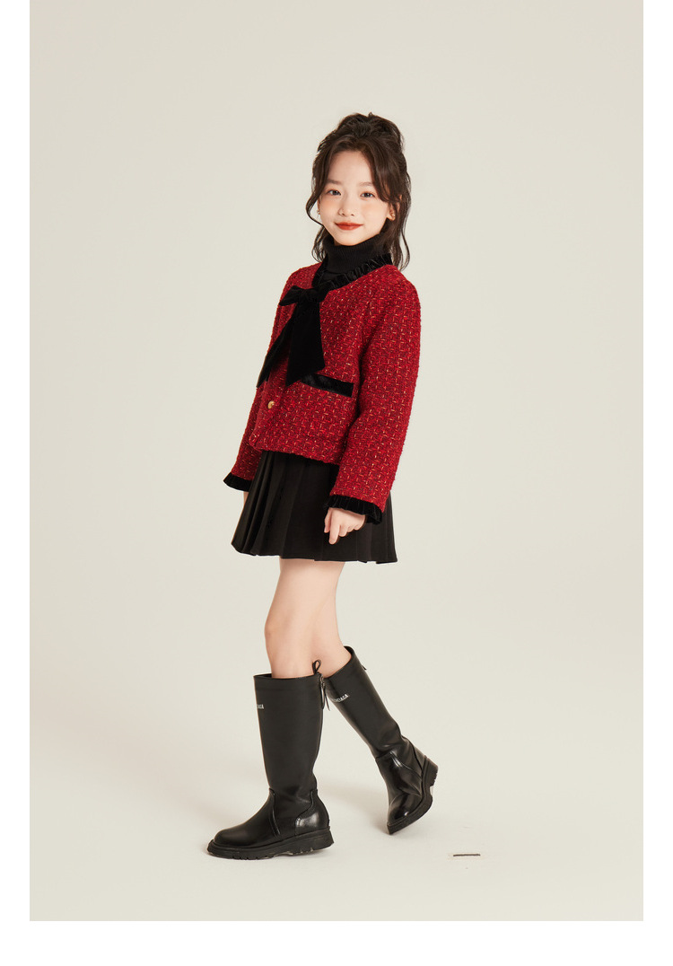 Amybaby Girls 'Top Winter 2024 새로운 레드 샤넬 스타일 우아한 활 두꺼운 재킷