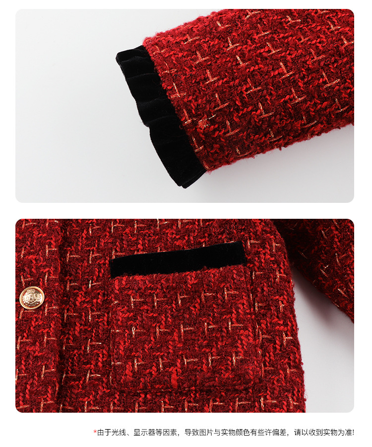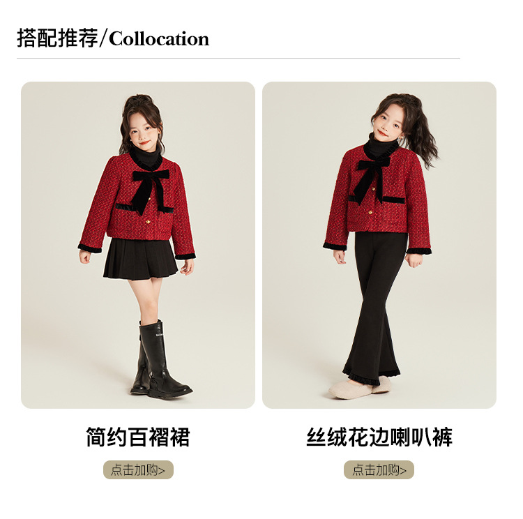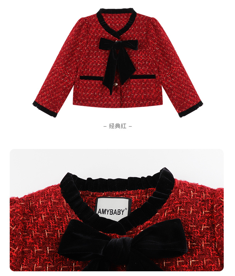 Amybaby Girls 'Top Winter 2024 새로운 레드 샤넬 스타일 우아한 활 두꺼운 재킷스토어 가기