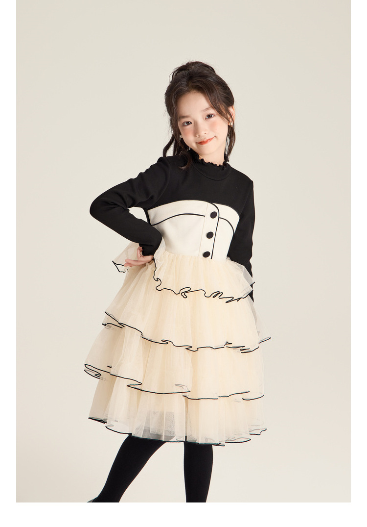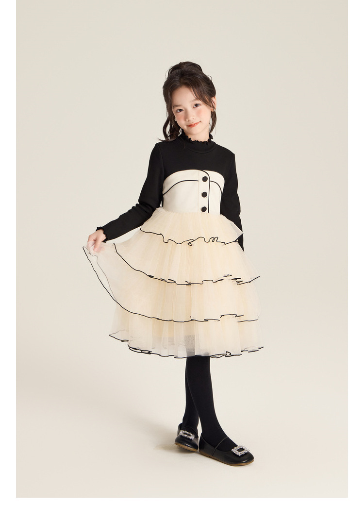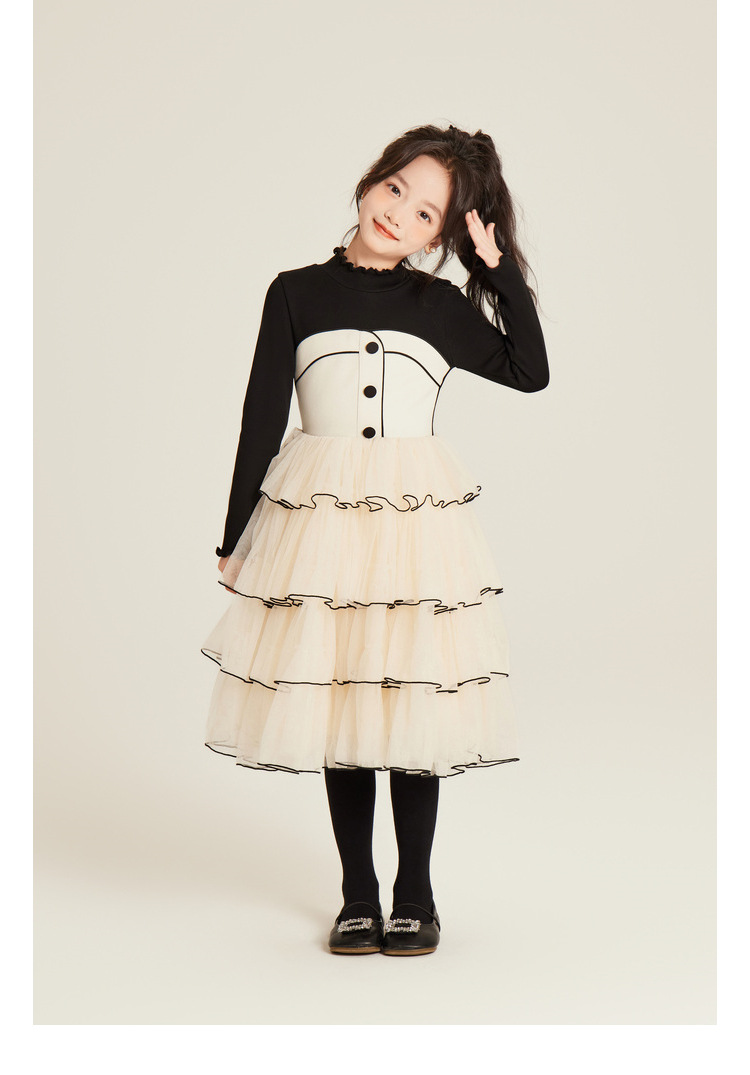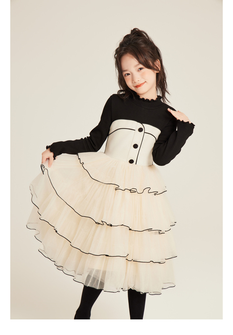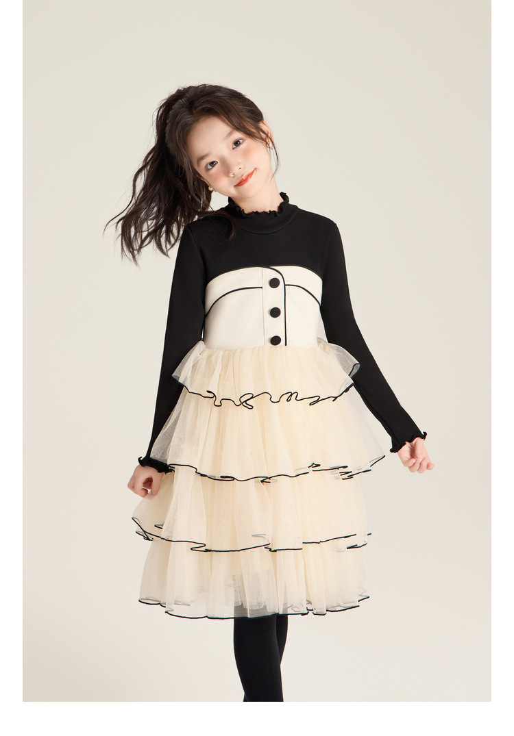Amybaby 소녀 원피스 겨울 2024 새로운 어린이 복고풍 스티칭 메쉬 원피스스토어 가기