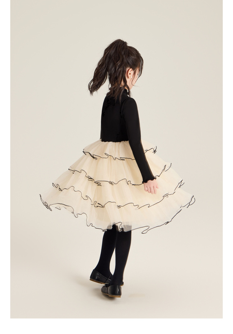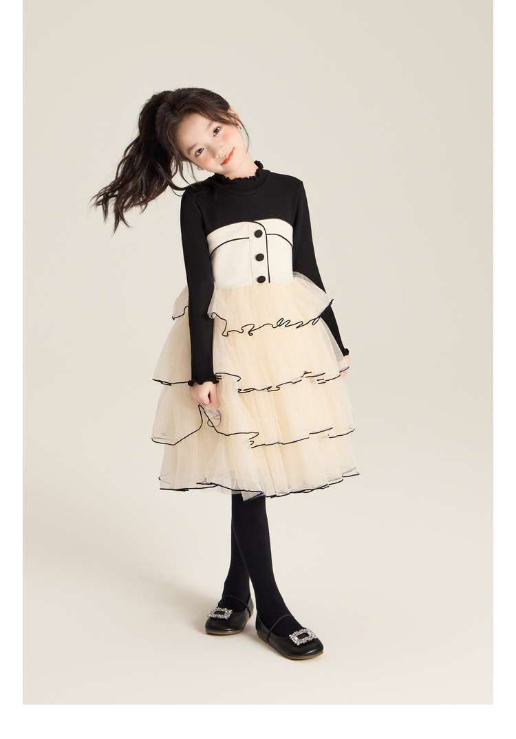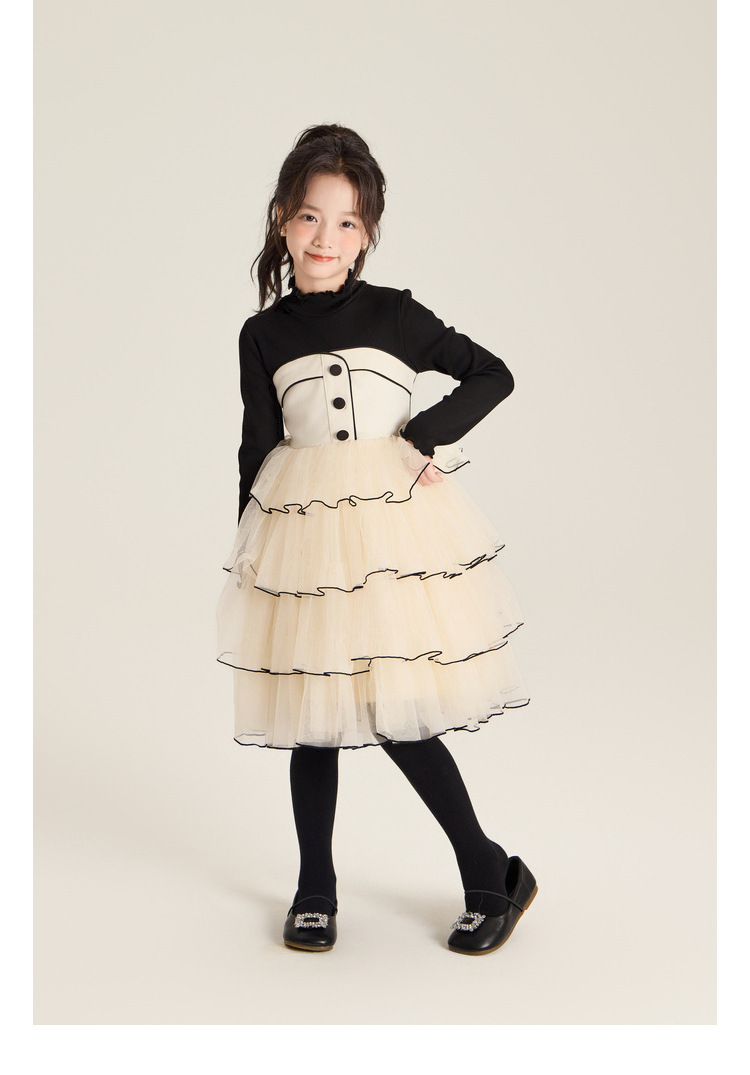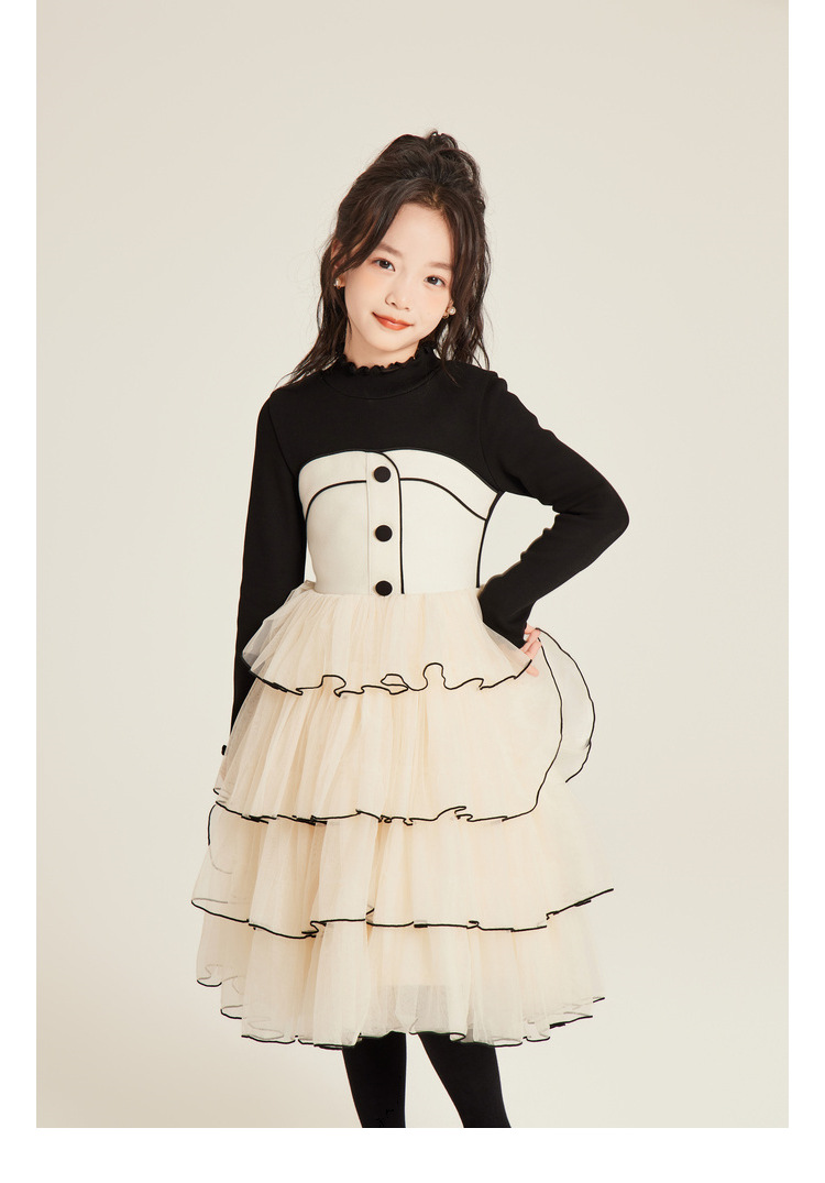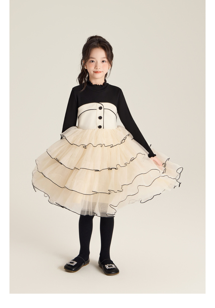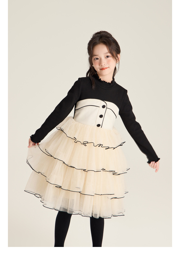 Amybaby 소녀 원피스 겨울 2024 새로운 어린이 복고풍 스티칭 메쉬 원피스스토어 가기