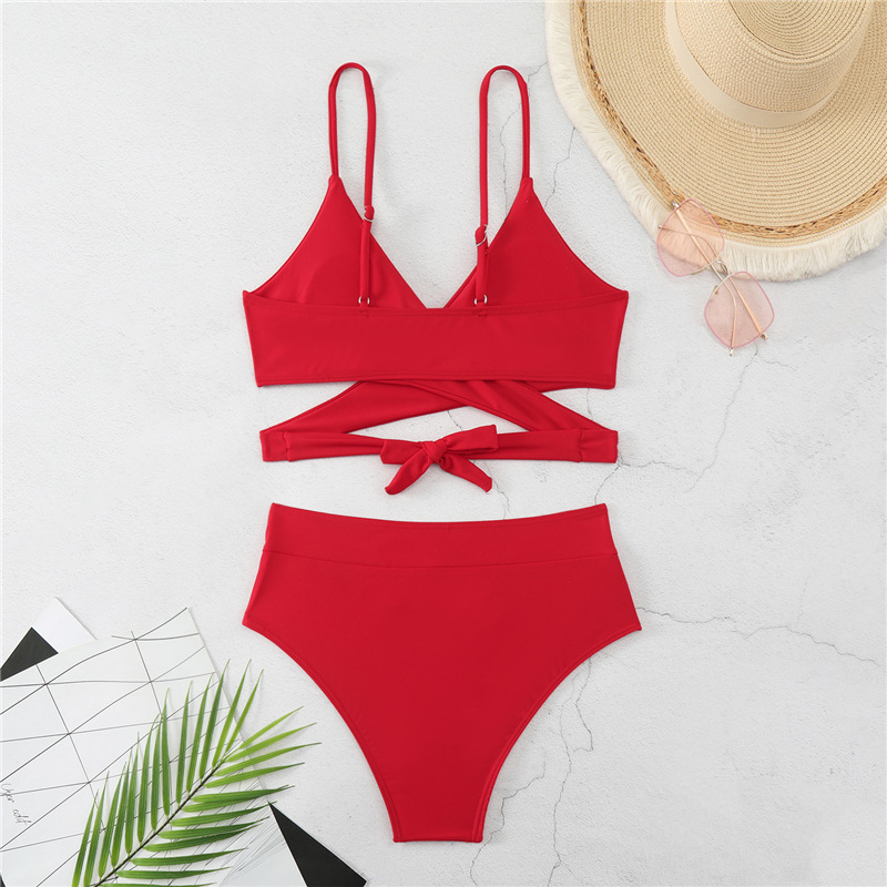 국경 2025 유럽과 미국 대외 무역 새로운 단색 크로스 레이스 아마존 비키니 높은 허리 등이없는 분할 수영복스토어 가기