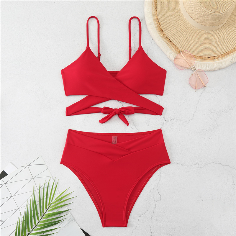 국경 2025 유럽과 미국 대외 무역 새로운 단색 크로스 레이스 아마존 비키니 높은 허리 등이없는 분할 수영복