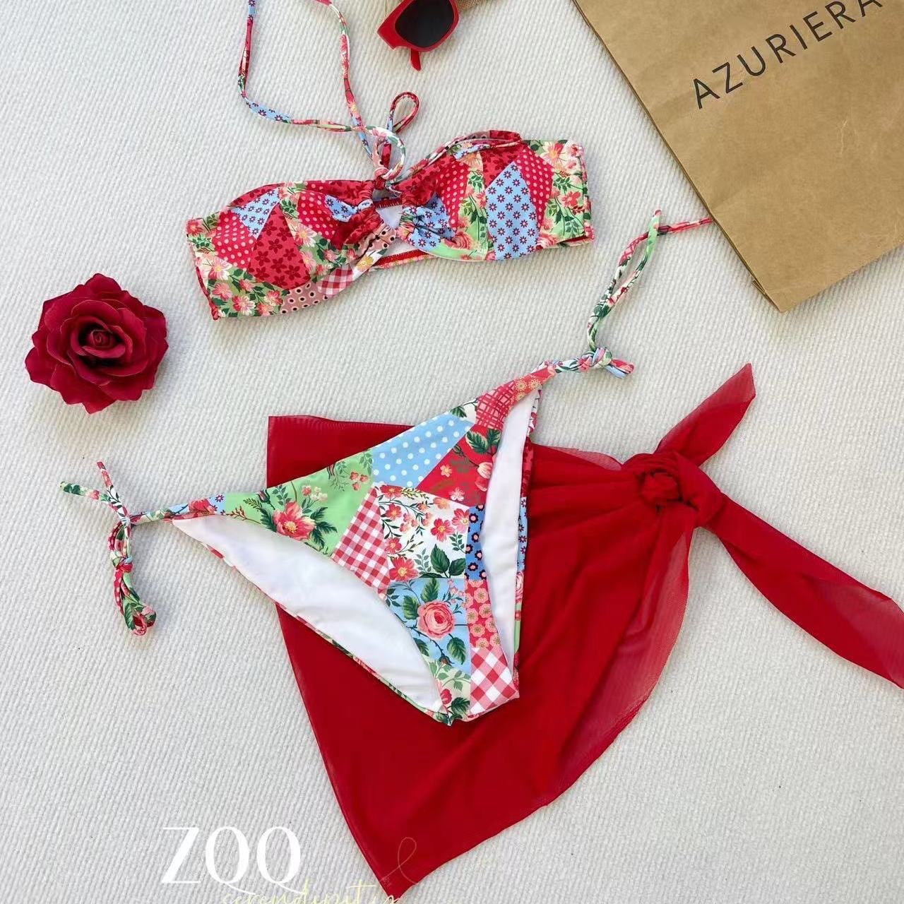 Mosricci 순수한 욕망 레드 화이트 민족 인쇄 비키니 분할 수영복 여성용 작은 가슴 튜브 탑 커버 스커트