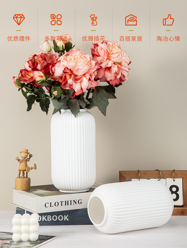 공장 도매 흰색 모조 세라믹 꽃병 고급 고급 줄무늬 거실 장식품은 물 플라스틱 꽃병을 저장할 수 있습니다