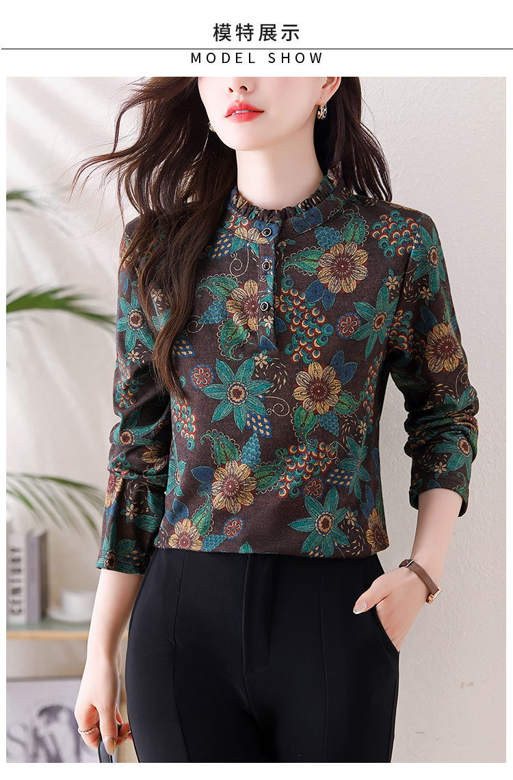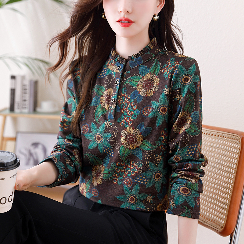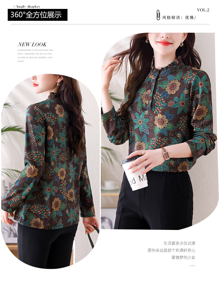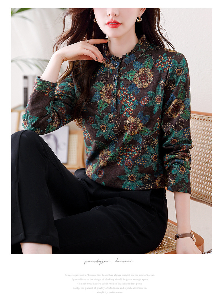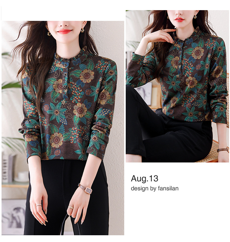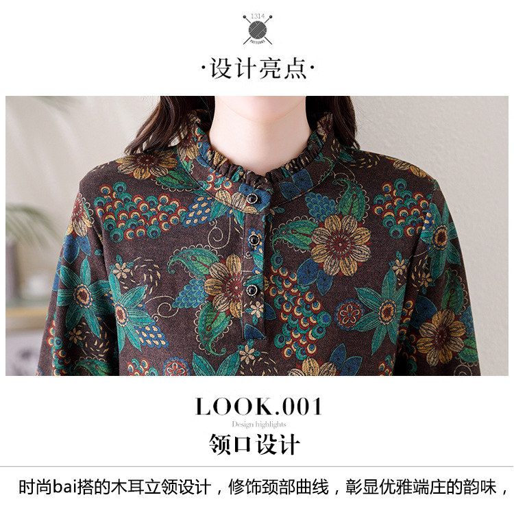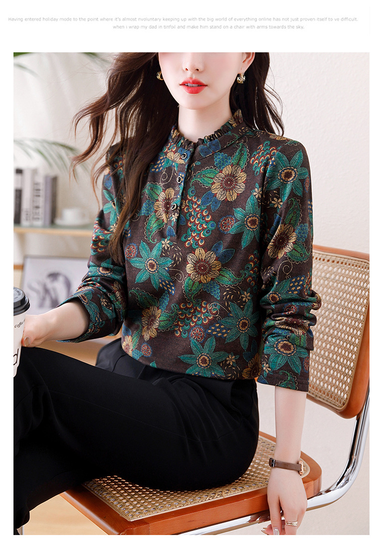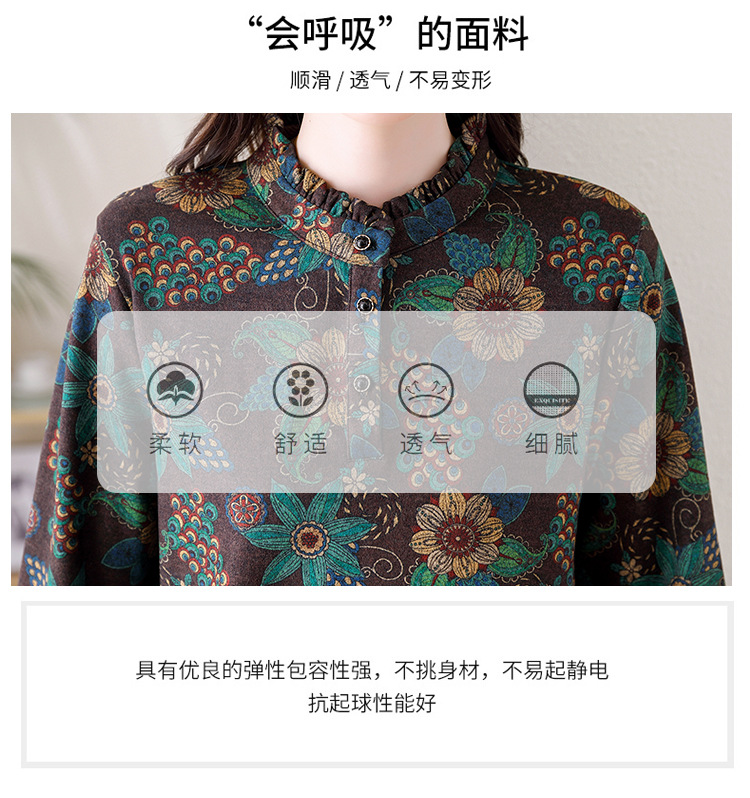 2024 년 가을과 겨울 새로운 긴팔 인쇄 모든 경기 어머니의 나이 감소 칼라 아오 벨벳 따뜻한 백킹 셔츠 여성용 탑