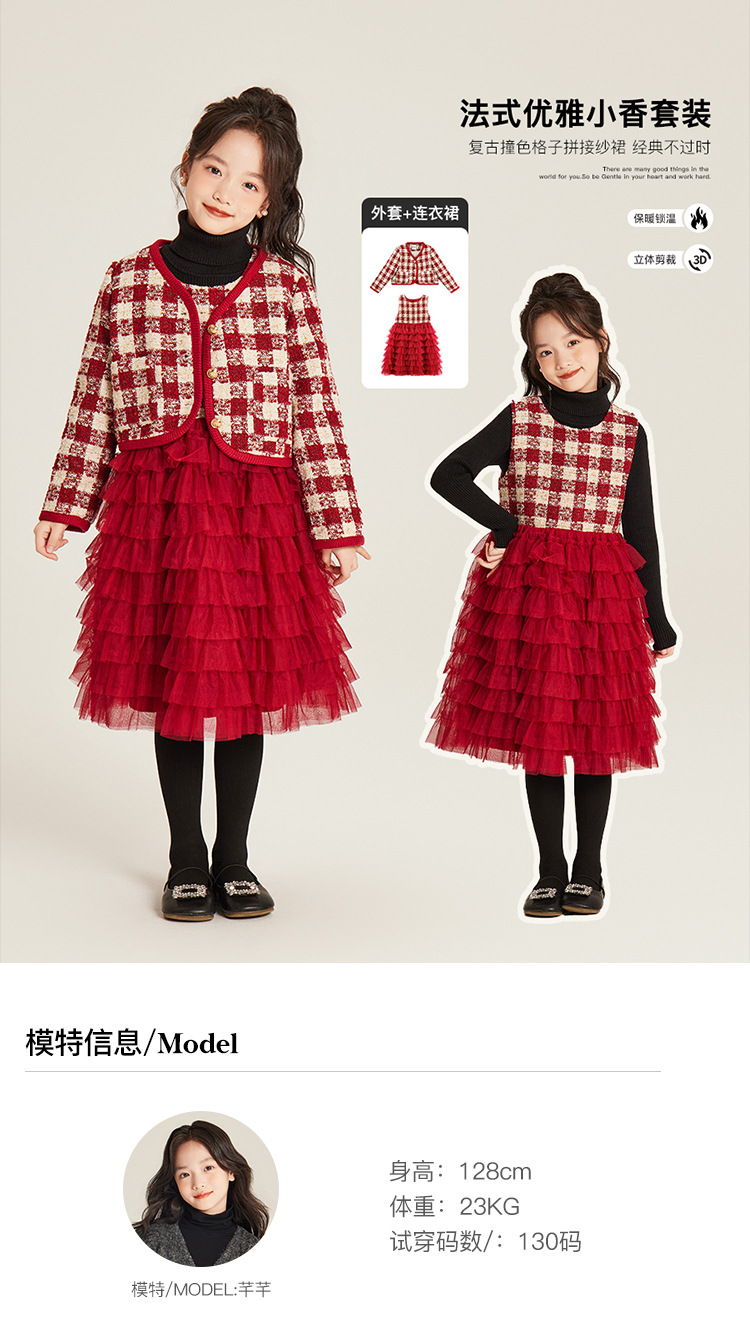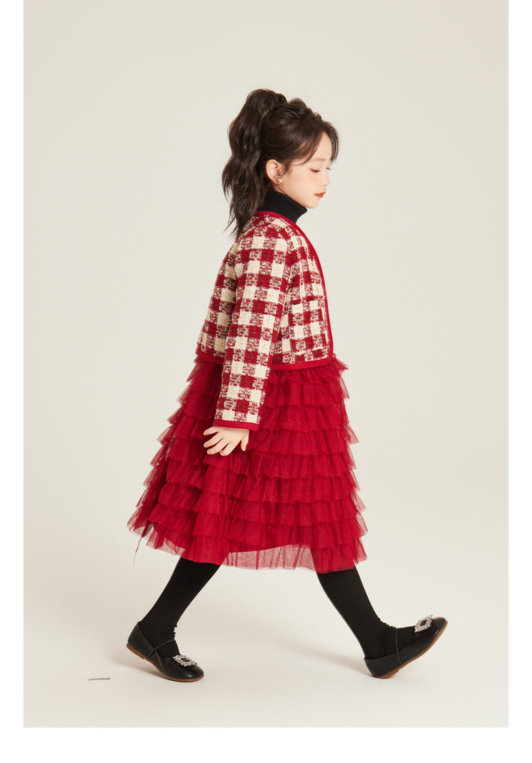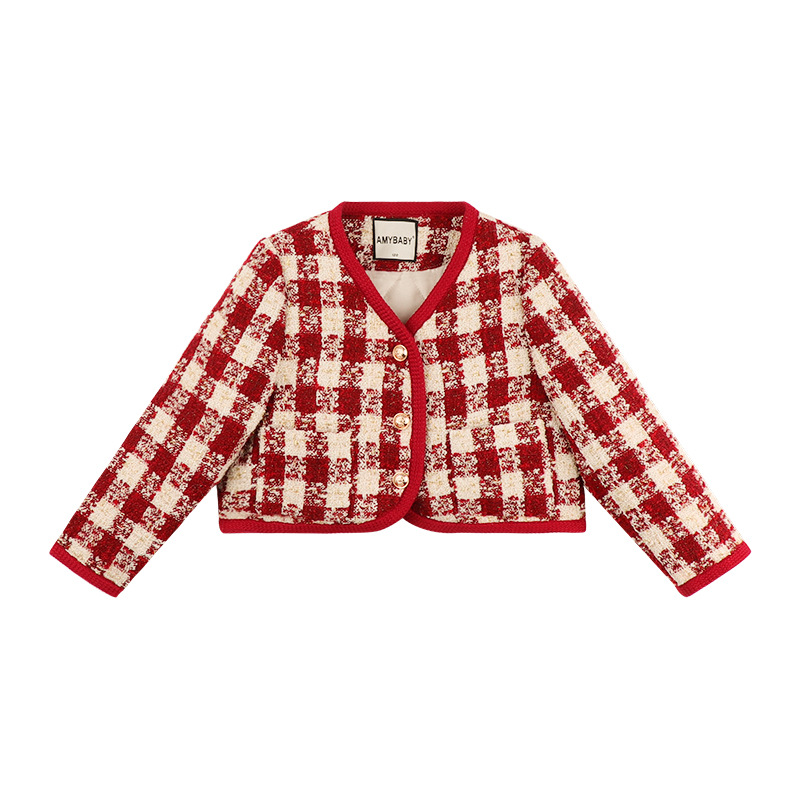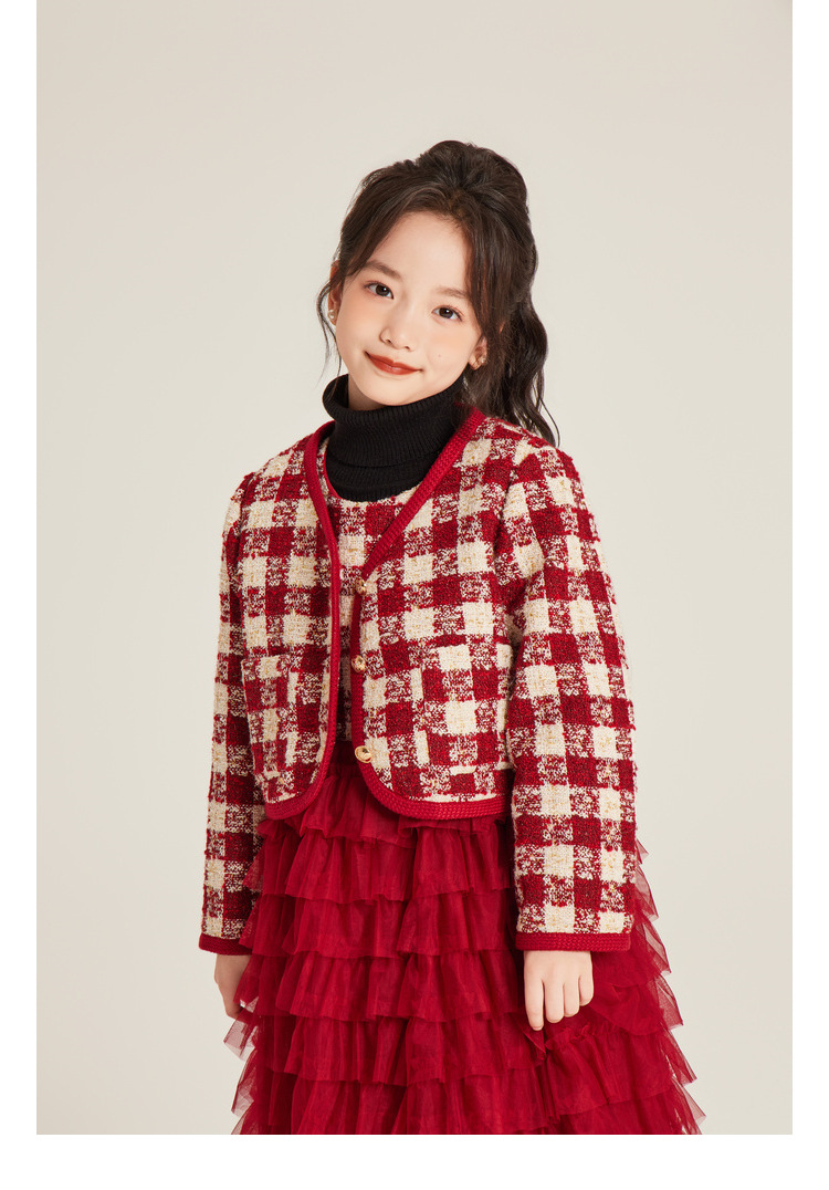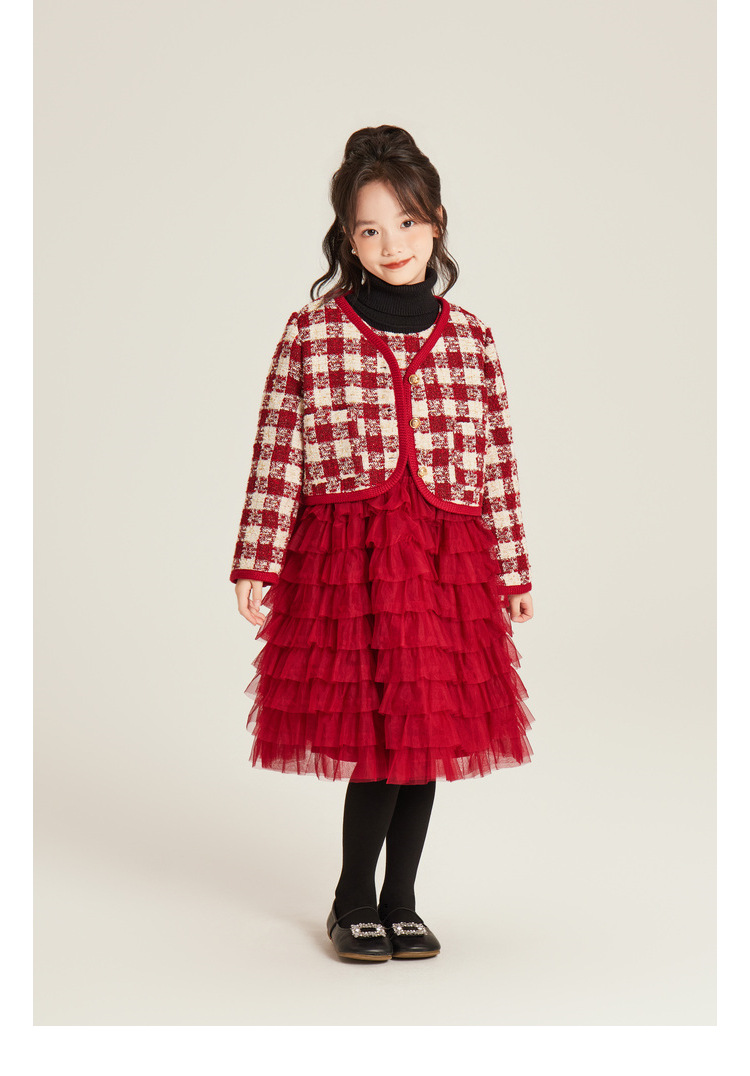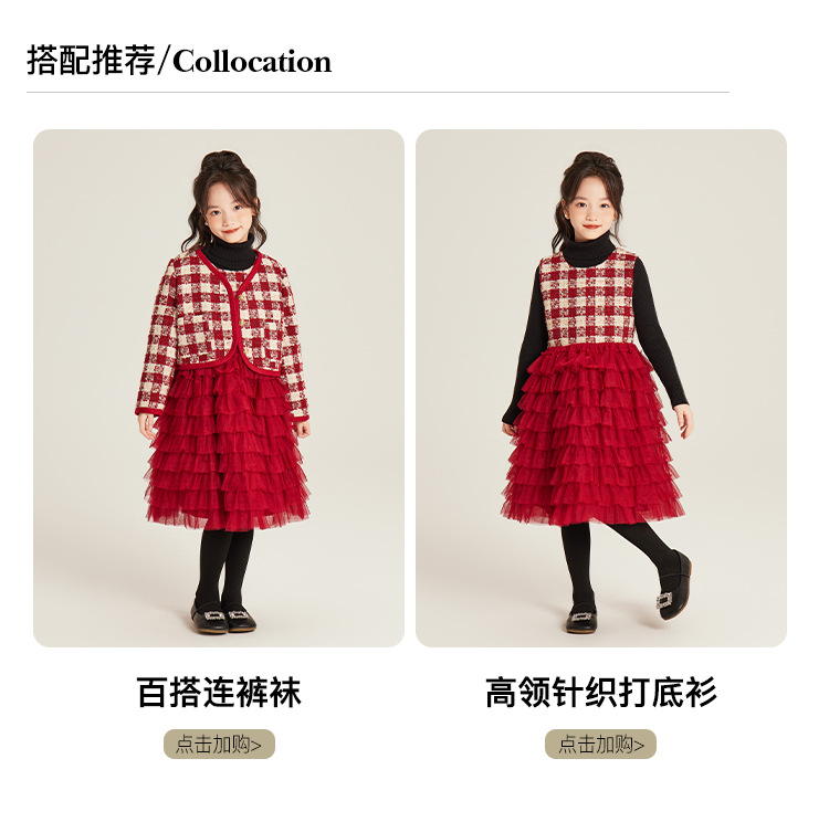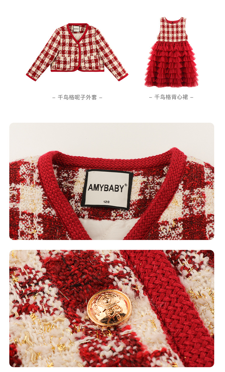 Amybaby 여자 세트 겨울 2024 새로운 스타일 샤넬 스타일 겨울 공주 원피스 Houndstooth 모직 코트