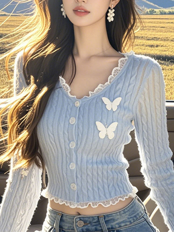 2025년 초가을 패션 디자인 감각이 돋보이는 고급스러운 블루 레이스 니트 가디건 여성복
