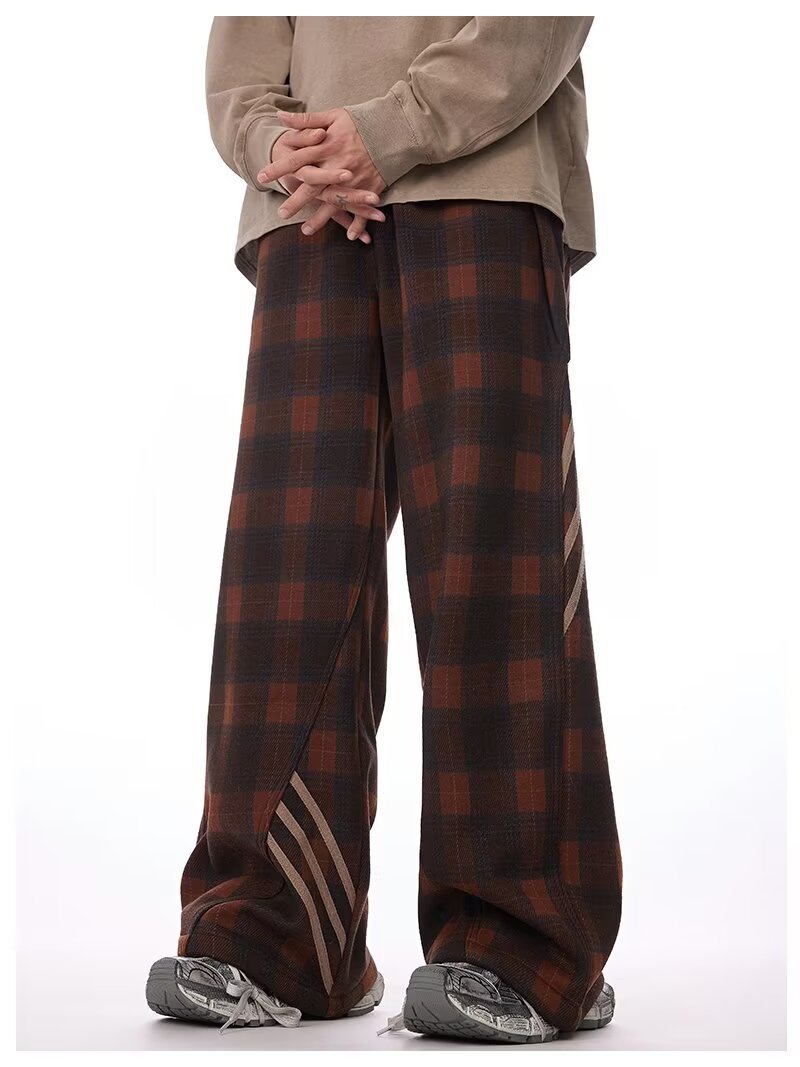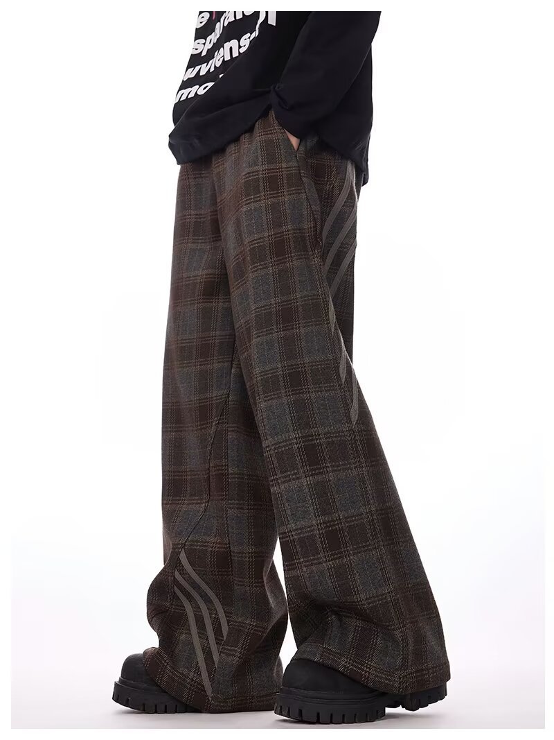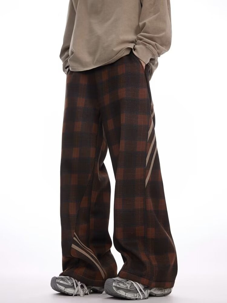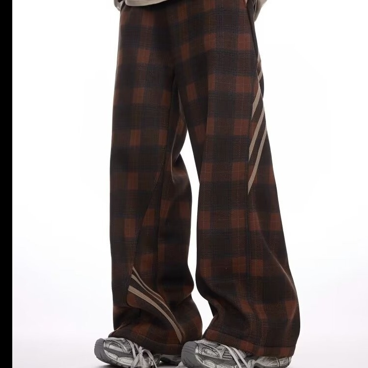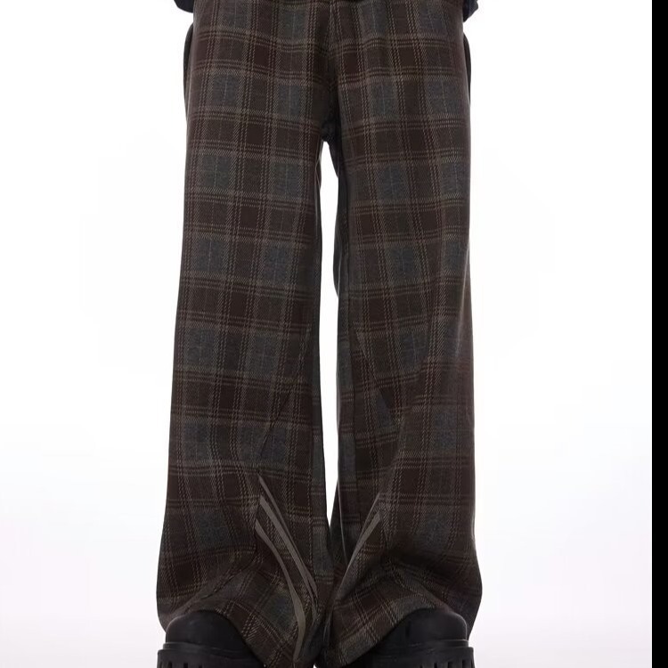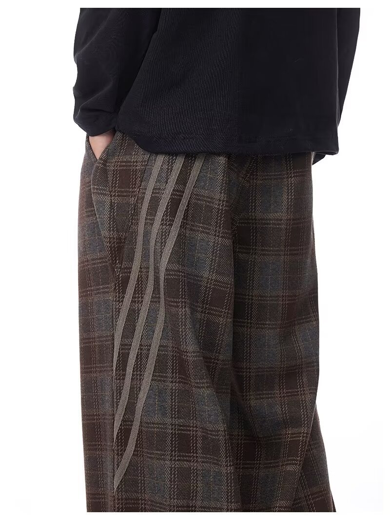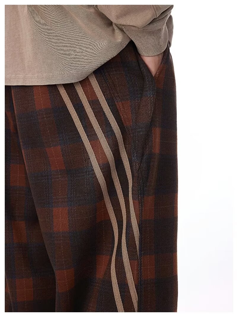 2024 틈새 디자인 센스 느슨한 격자 무늬 줄무늬 트리플 바 바지 남성용 간단한 우아한 게으른 스타일 하이 스트리트 바지