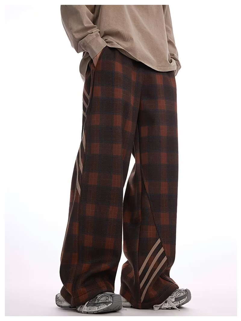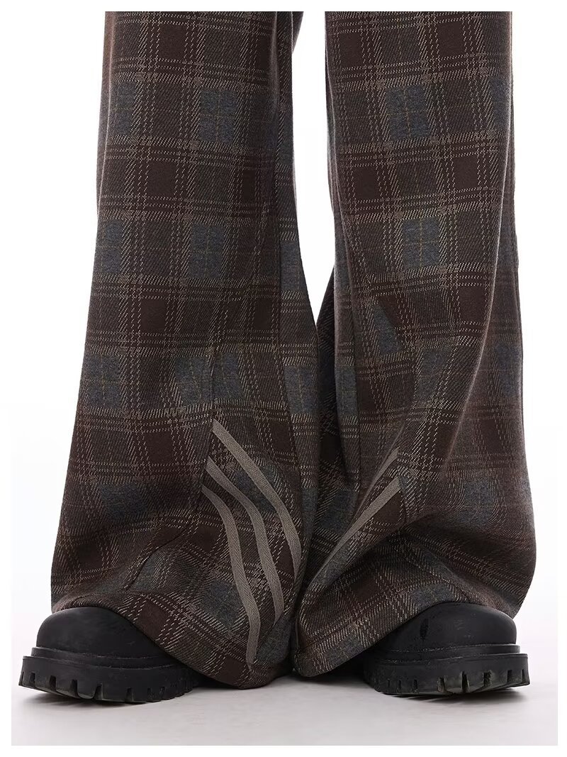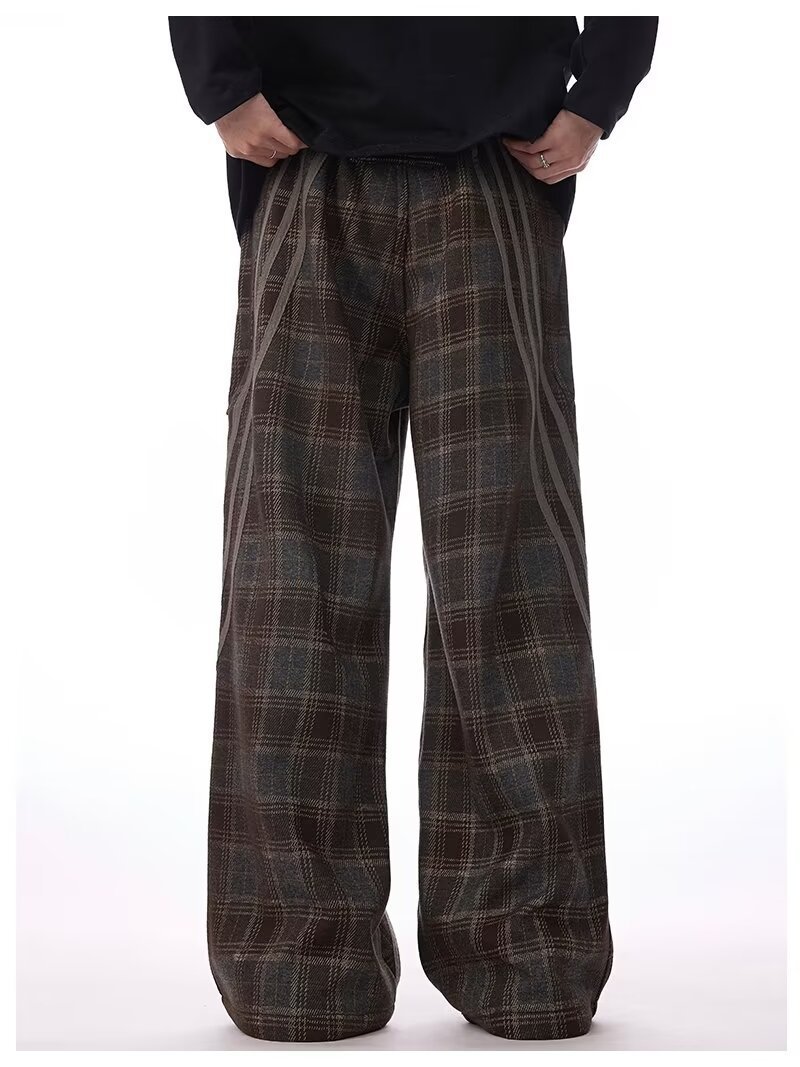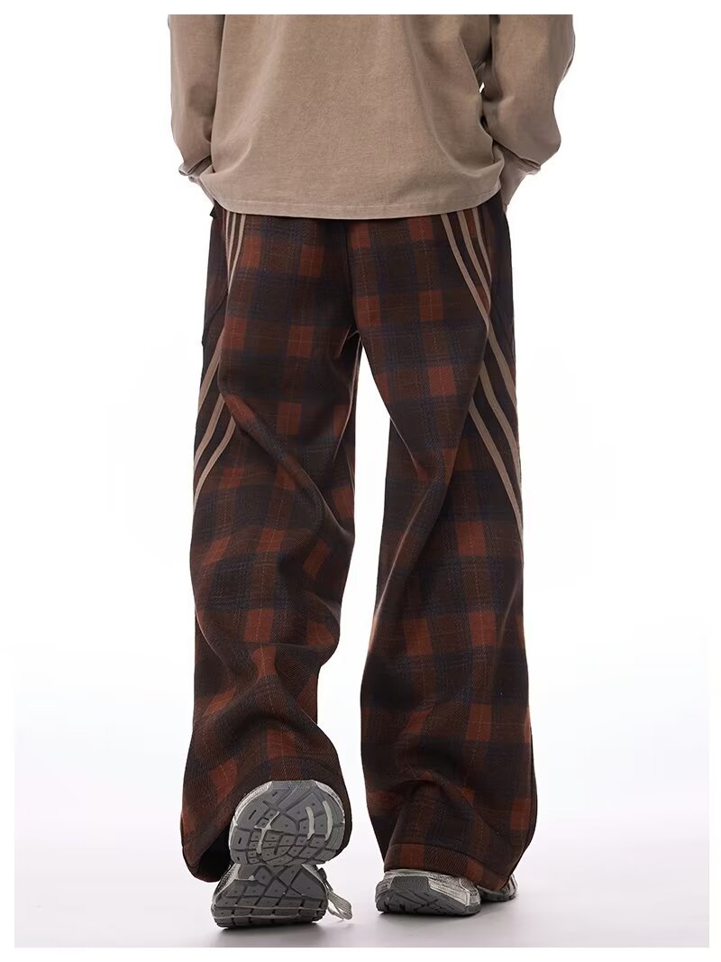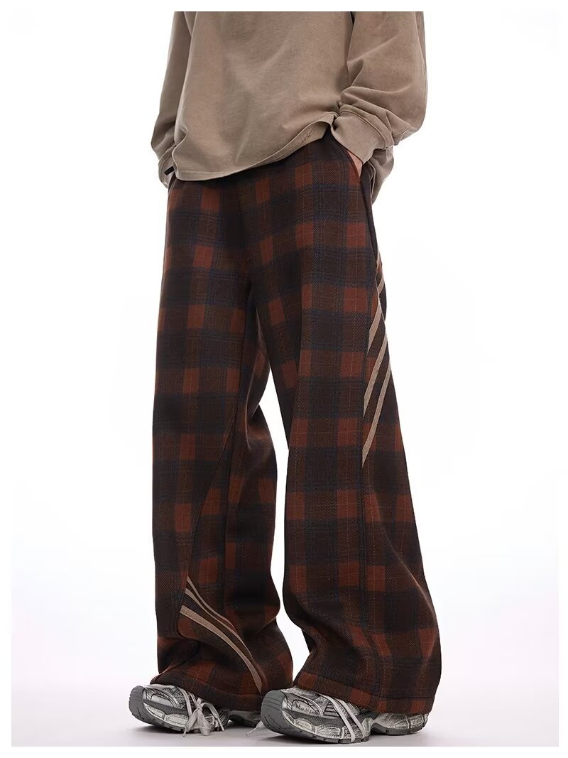 2024 틈새 디자인 센스 느슨한 격자 무늬 줄무늬 트리플 바 바지 남성용 간단한 우아한 게으른 스타일 하이 스트리트 바지