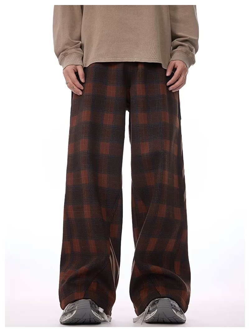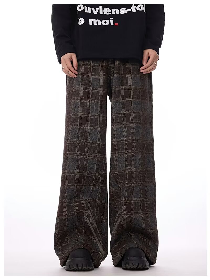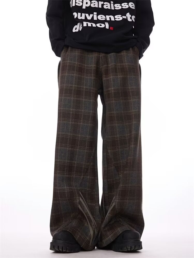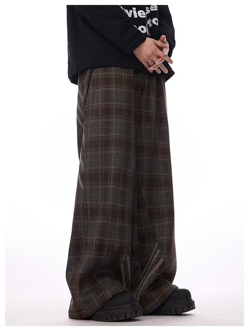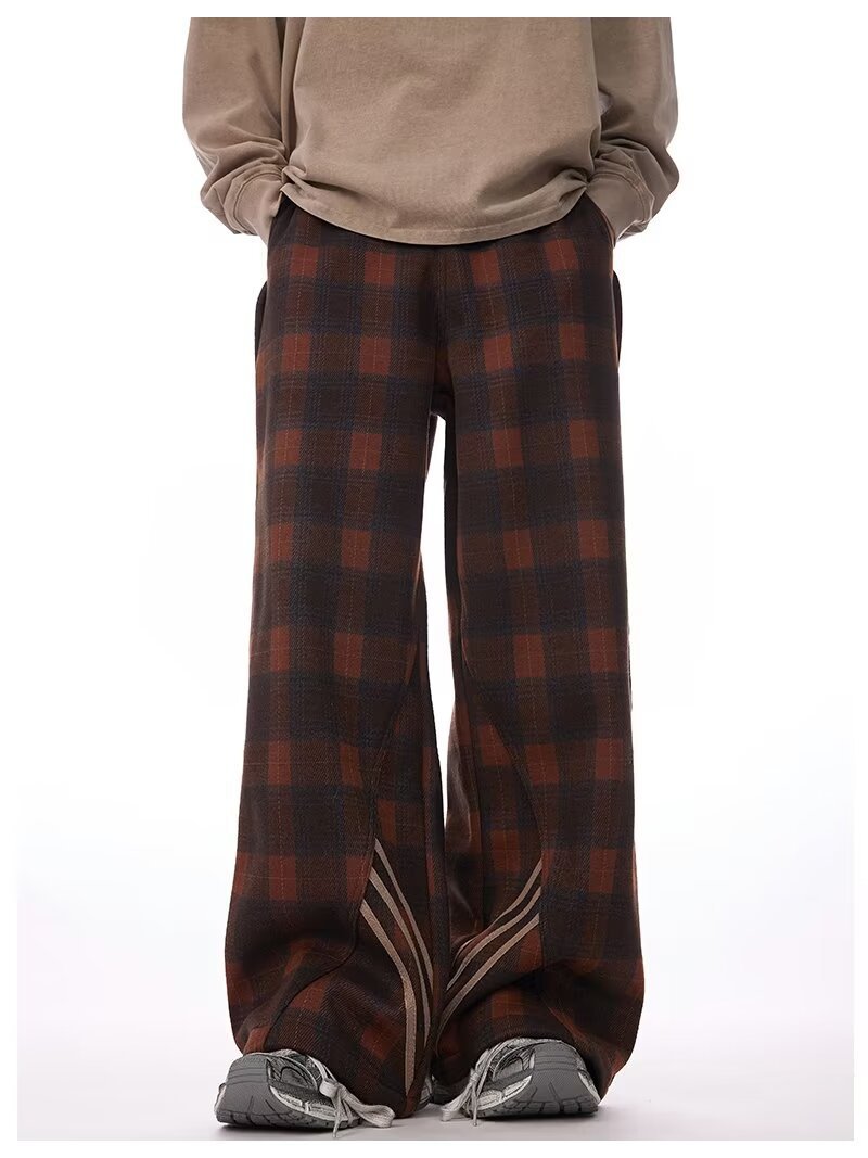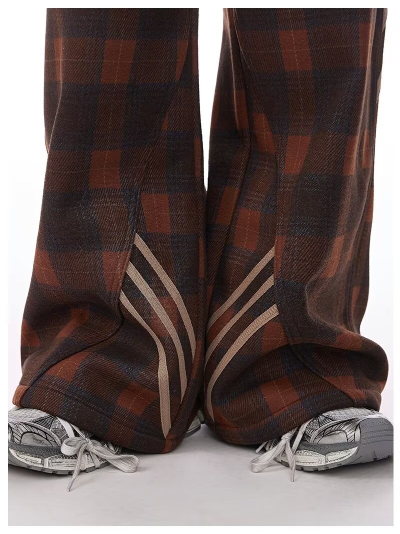 2024 틈새 디자인 센스 느슨한 격자 무늬 줄무늬 트리플 바 바지 남성용 간단한 우아한 게으른 스타일 하이 스트리트 바지