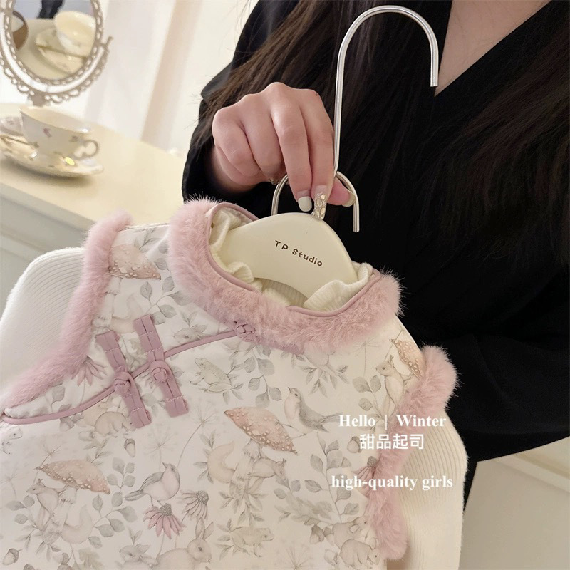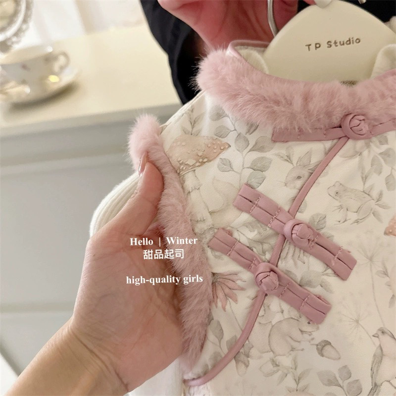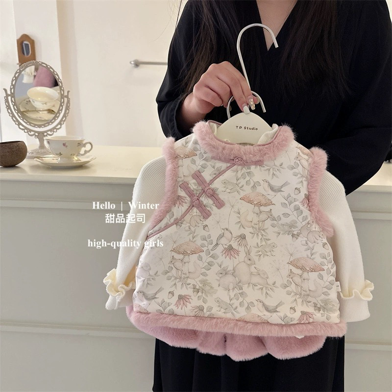 아기의 새로운 중국 스타일 새 소녀 겨울 두꺼운 조끼 수직 칼라 진주 버클 따뜻한 조끼 세트스토어 가기
