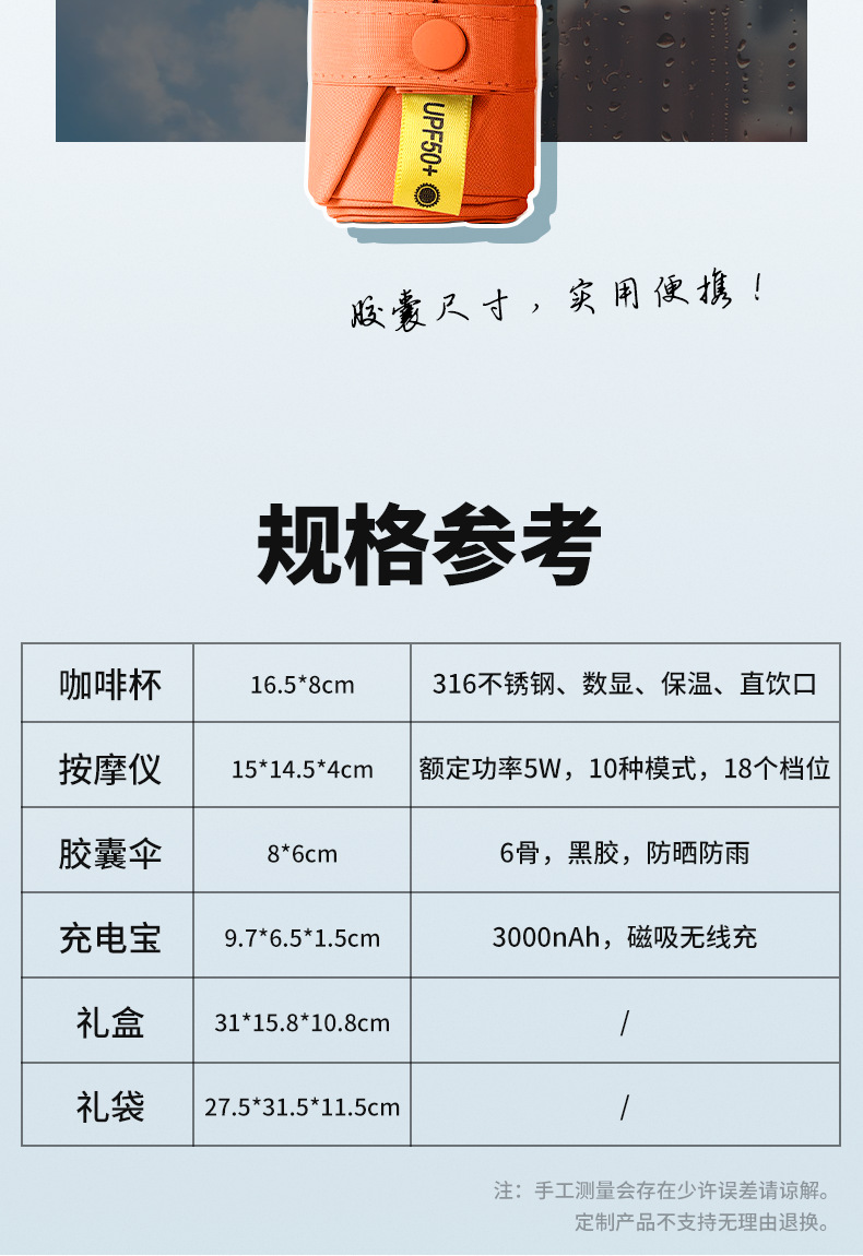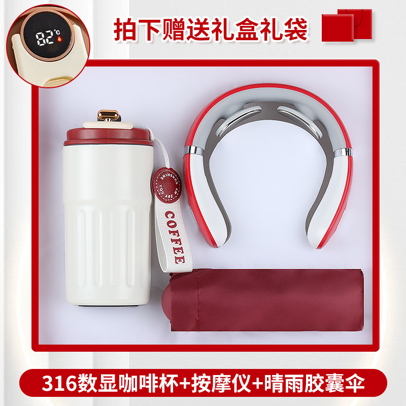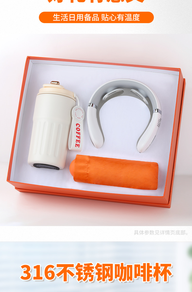 • 316 디지털 커피 컵 화이트 + 마사지기 화이트 + 캡슐 우산 오렌지 + 상자 가방 오렌지