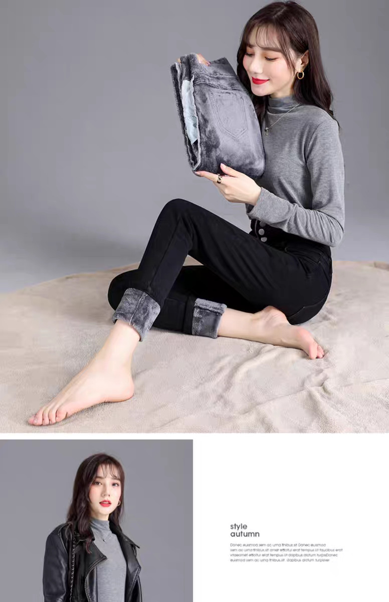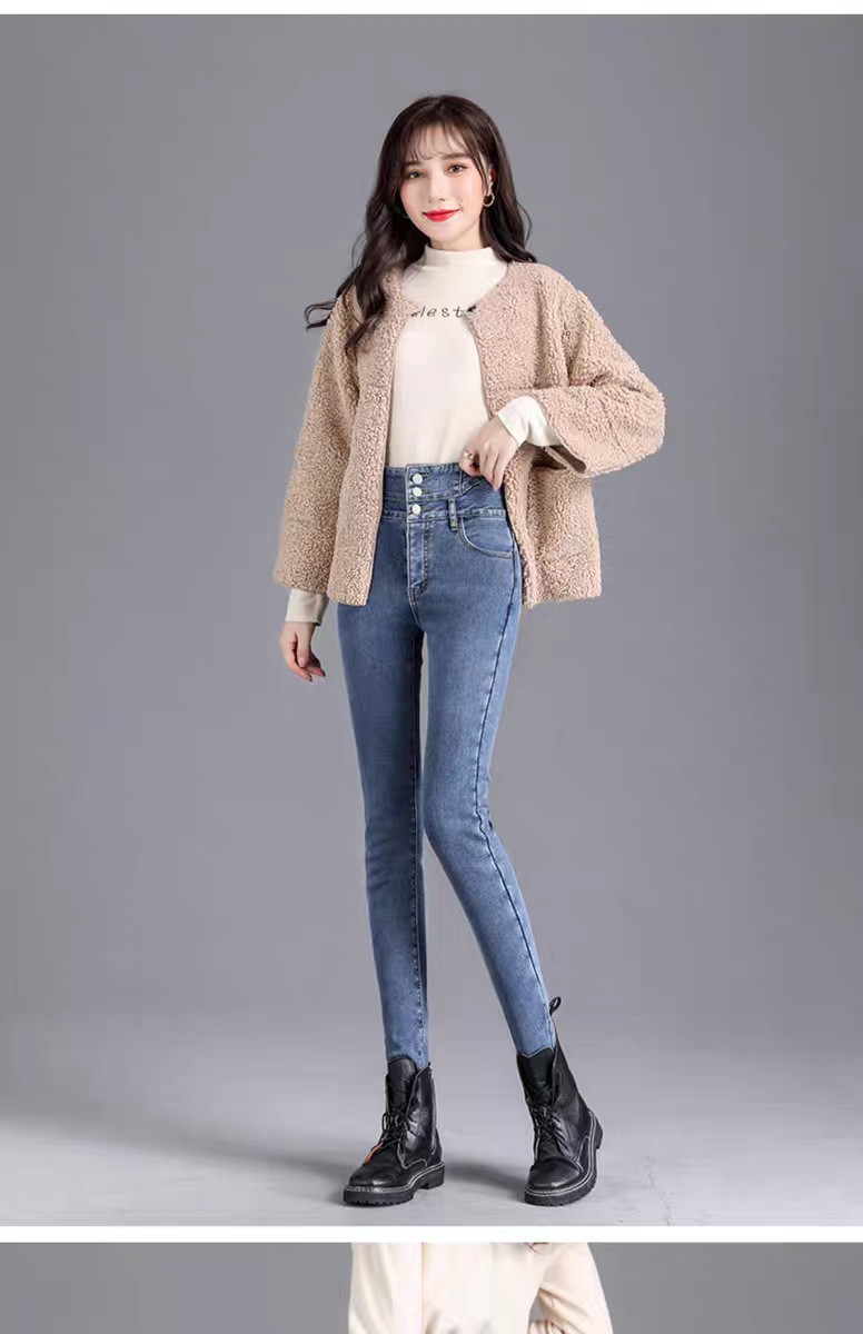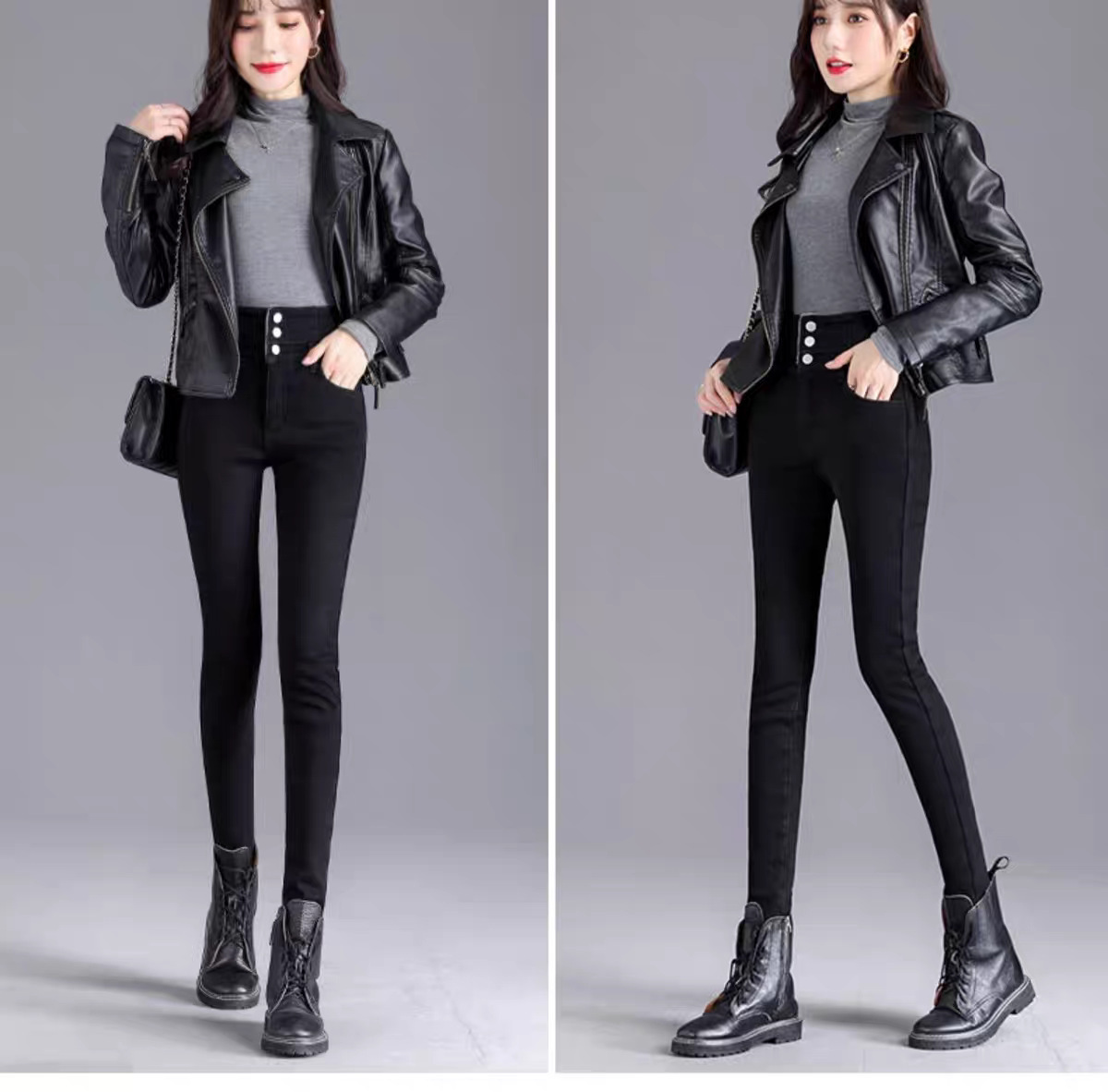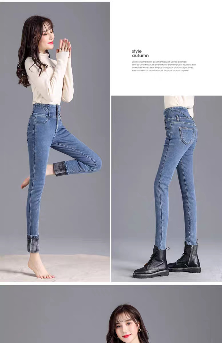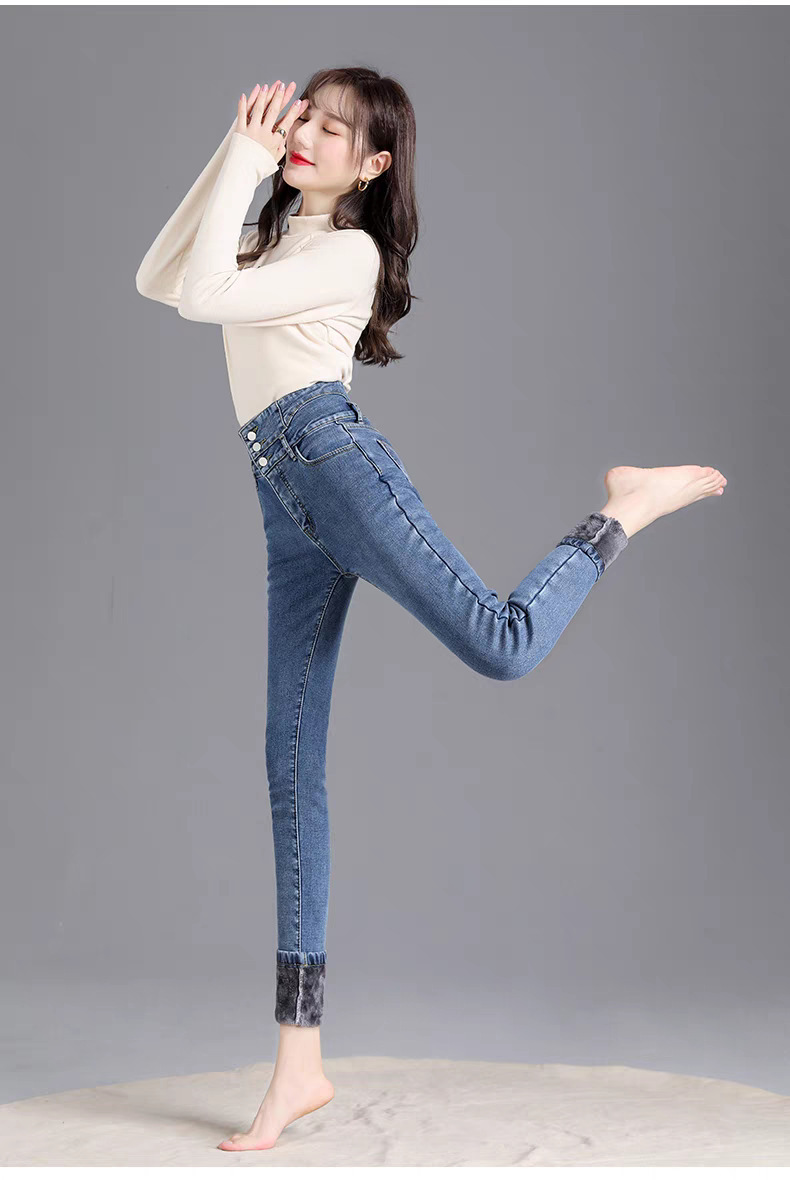 가을과 겨울 2024 새로운 기모 높은 허리 청바지 여성용 스트레치 연필 슬림핏 슬리밍 연필 바지스토어 가기