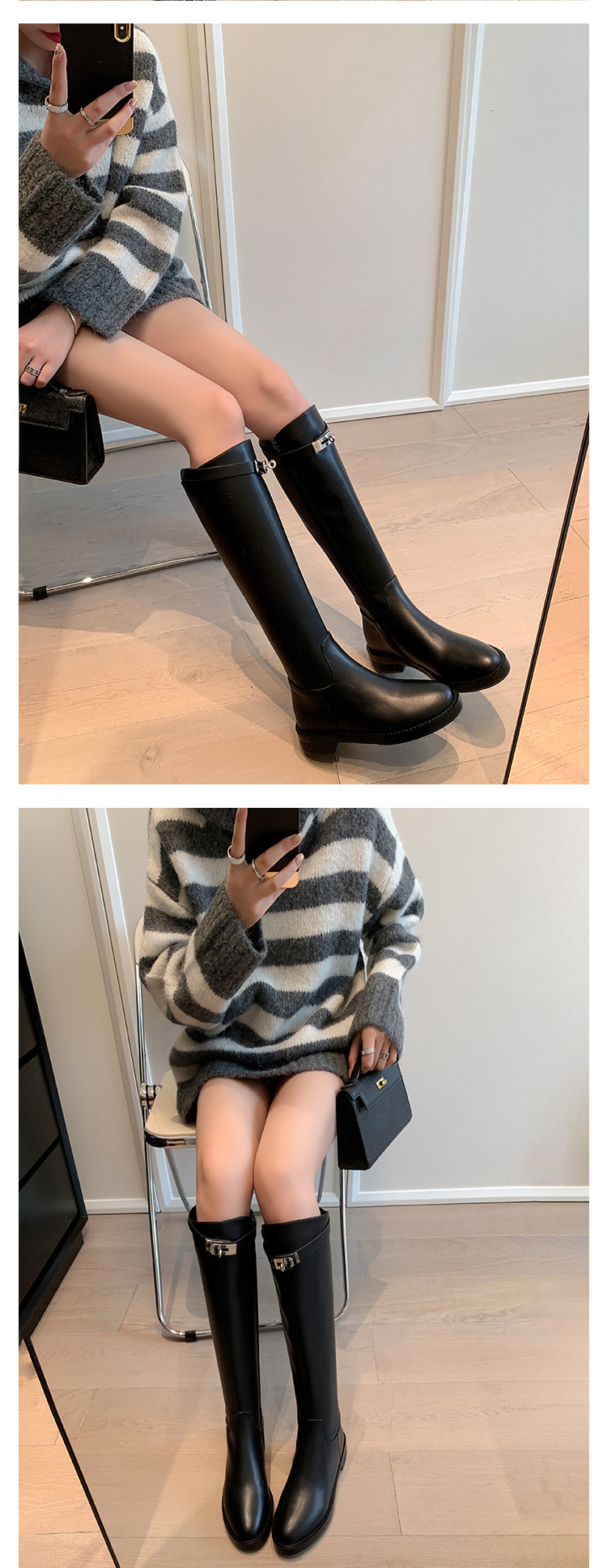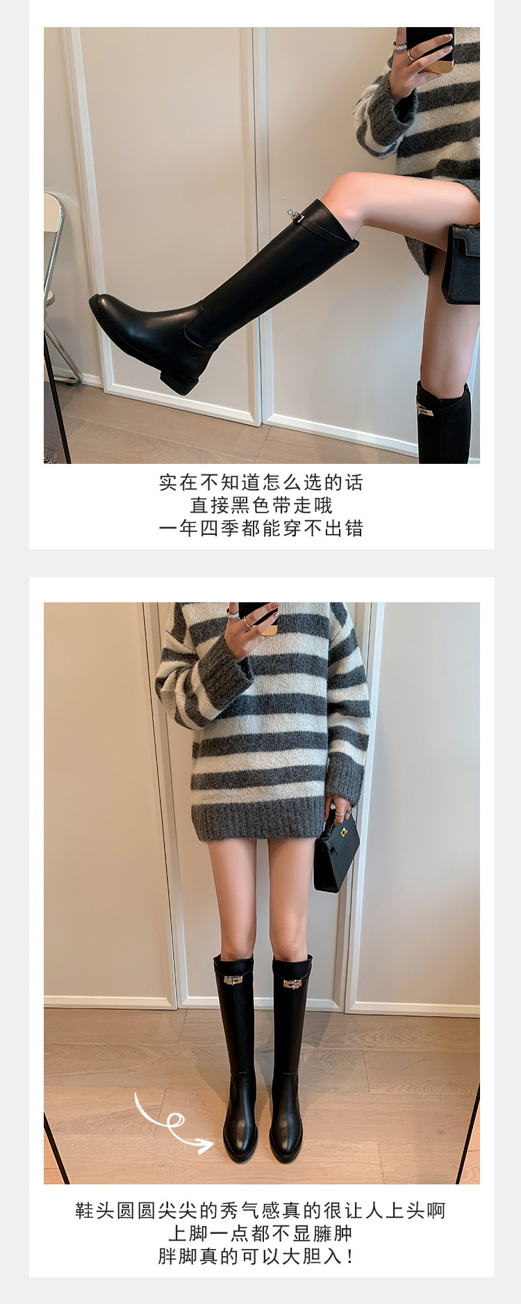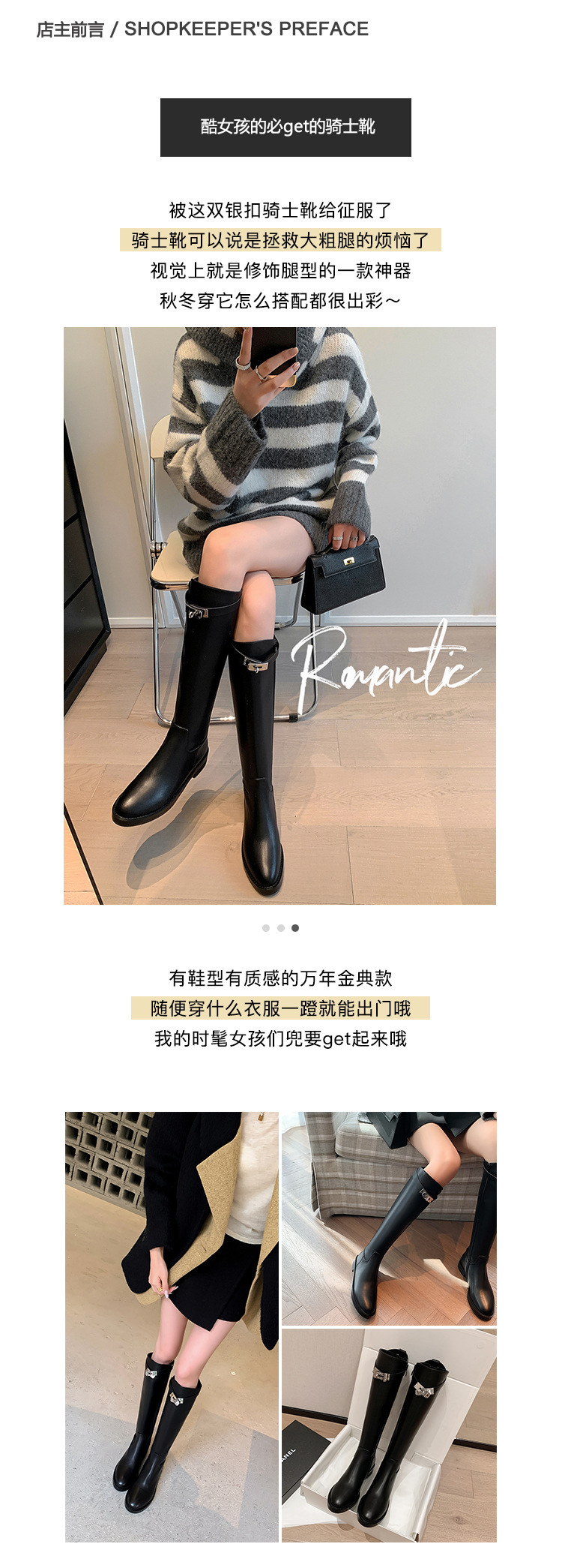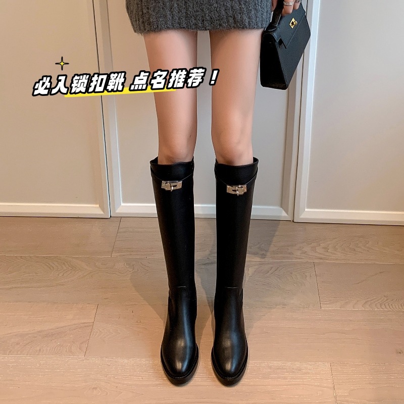 편안한 올 매치 메탈 잠금 라운드 헤드 Cowhide 기사 부츠 가을 및 겨울 2024 여성을위한 새로운 기사 높은 부츠스토어 가기