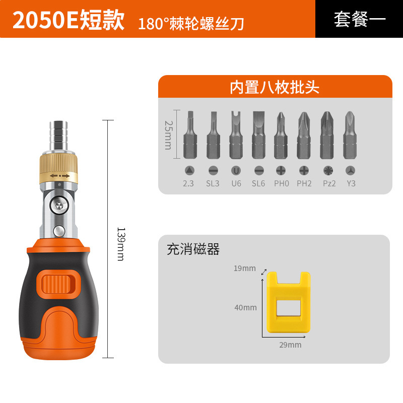 • 2050E(짧은) 래칫 드라이버 + 자화 장치 + 짧은 십자 한 단어 내부 육각형 조합