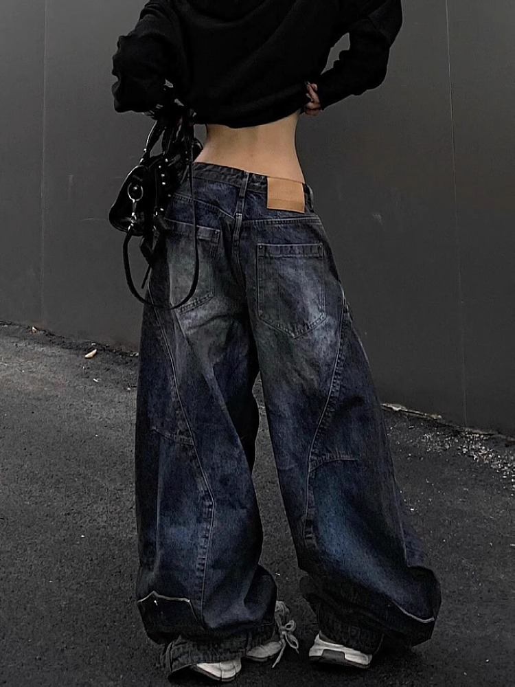 아메리칸 바이브 스트리트 사용 청바지 여성의 봄과 가을 새로운 패션 디자인 센스 반전 허리 넓은 다리 바지