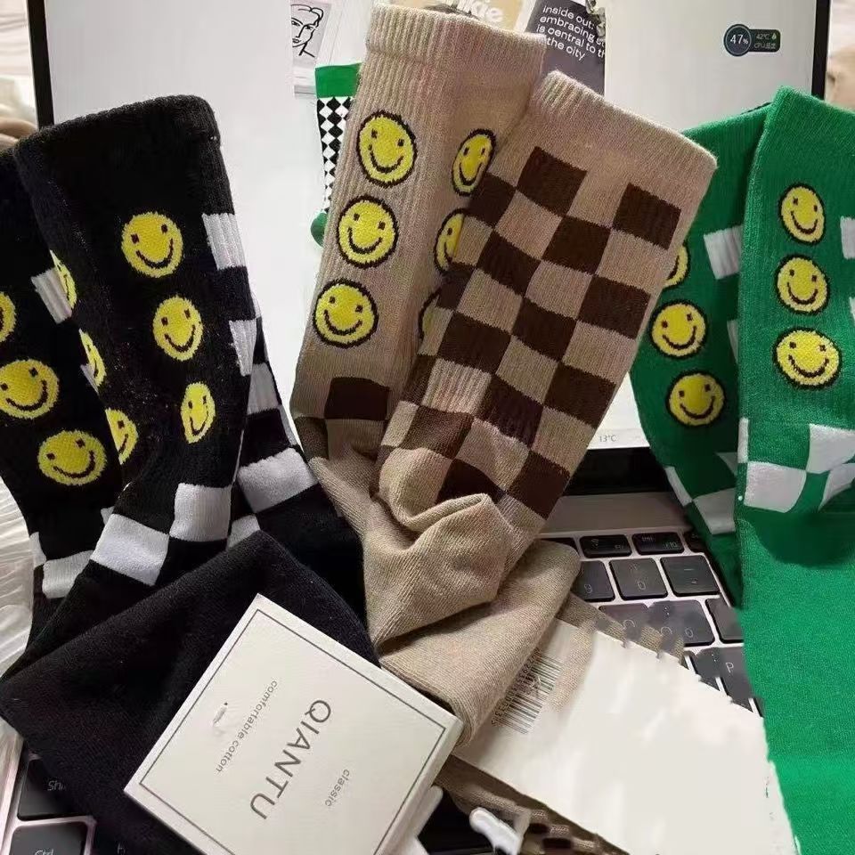 가을과 겨울 어린이를위한 미드 튜브 양말 한국 스타일 Ins 트렌디 체스보드 스마일 레트로 올매치 스포츠 트렌디 인터넷 연예인 동일 스타일스토어 가기
