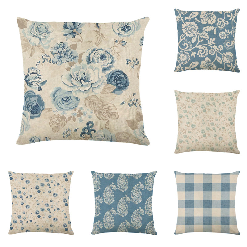 국경 간 레트로 크림과 블루 로즈 꽃 격자 무늬 베개 케이스 홈 소파 베개 케이스 사무실 베개스토어 가기