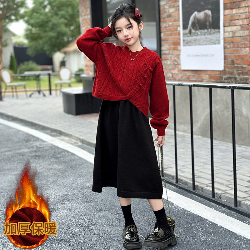 소녀 Guofeng 원피스 2024 가을/겨울 새로운 두꺼운 스웨터 어린 소녀의 달콤한 겨울 의류 투피스 타이드