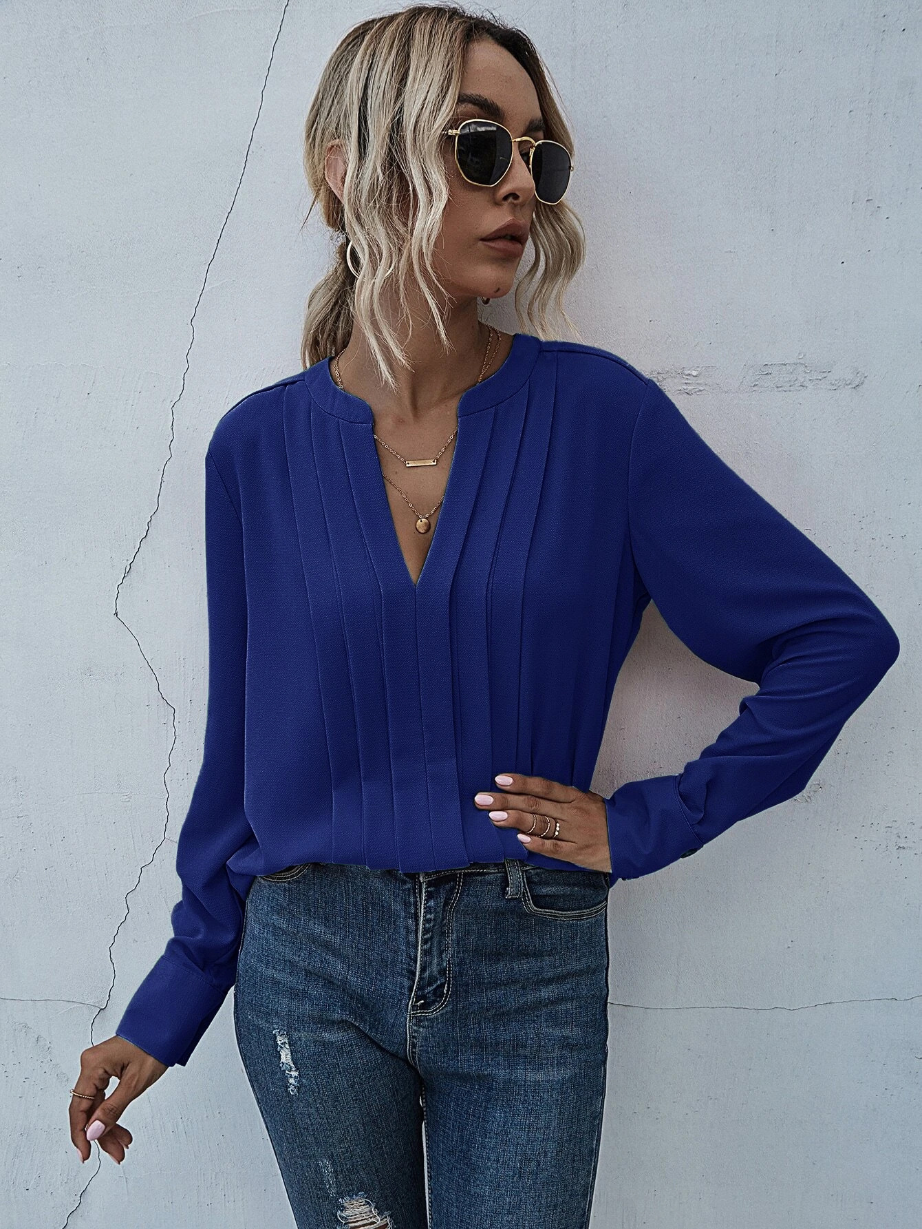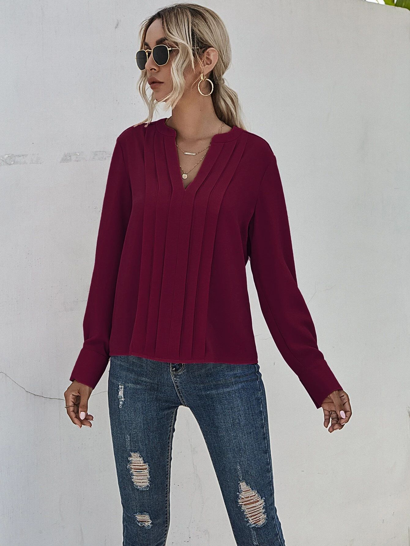 Ebay AliExpress 소원 2021 유럽 및 미국 V 넥 긴 소매 주름 쉬폰 기질 통근 단색 풀오버 셔츠스토어 가기