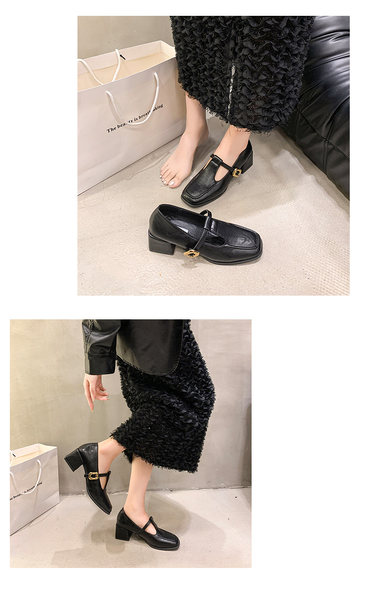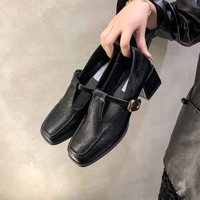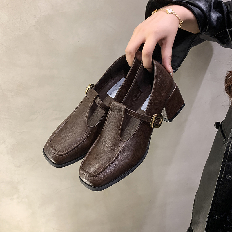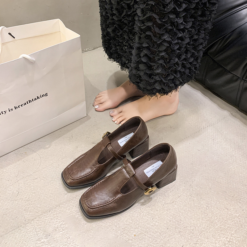 프랑스 레트로 스퀘어 발가락 청키 힐 신발 여성 봄과 가을 새로운 저녁 스타일 한국 스타일 요정 하이힐 메리 제인 작은 가죽 신발스토어 가기