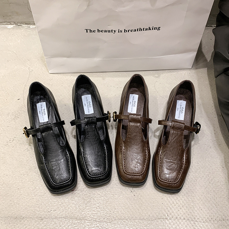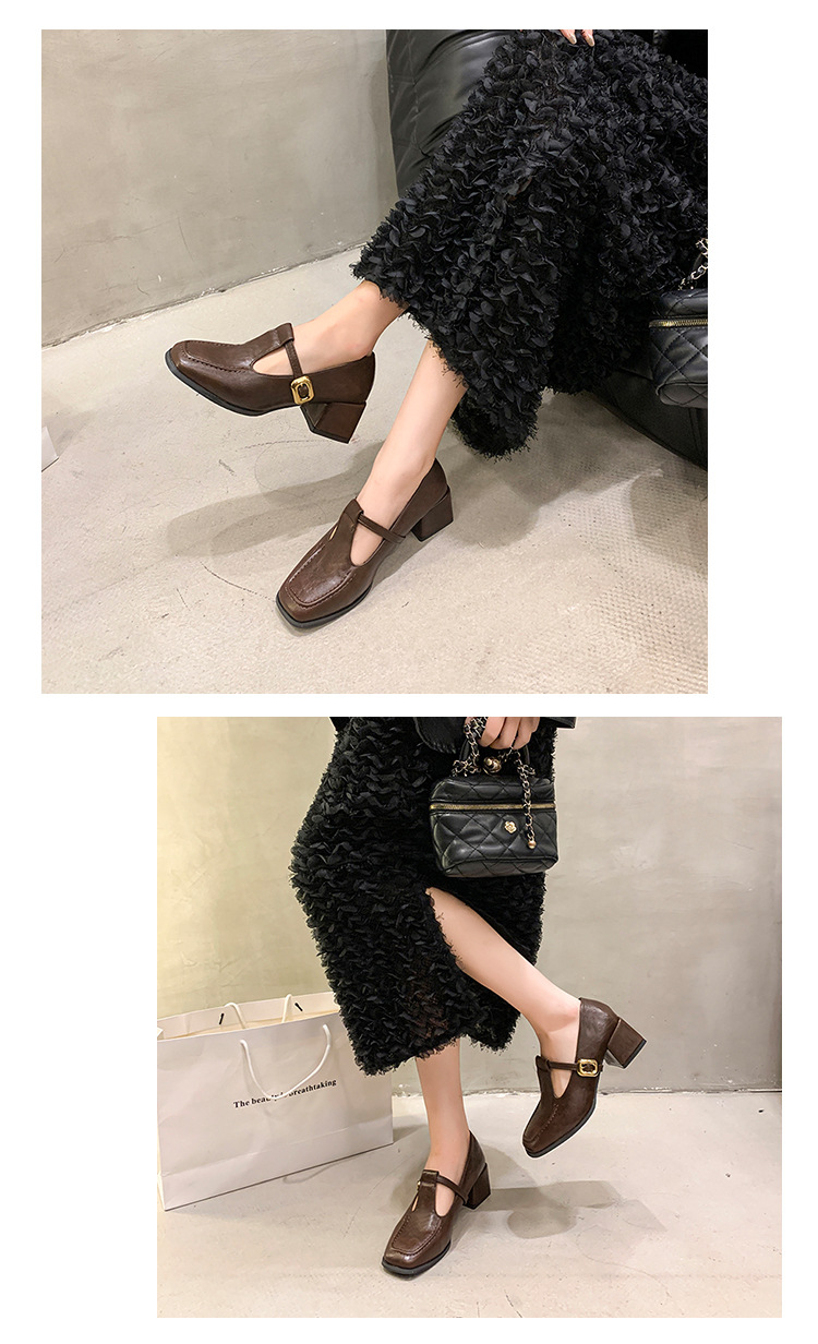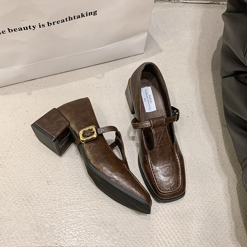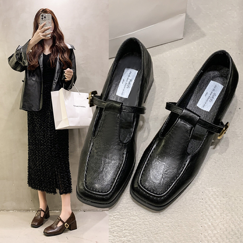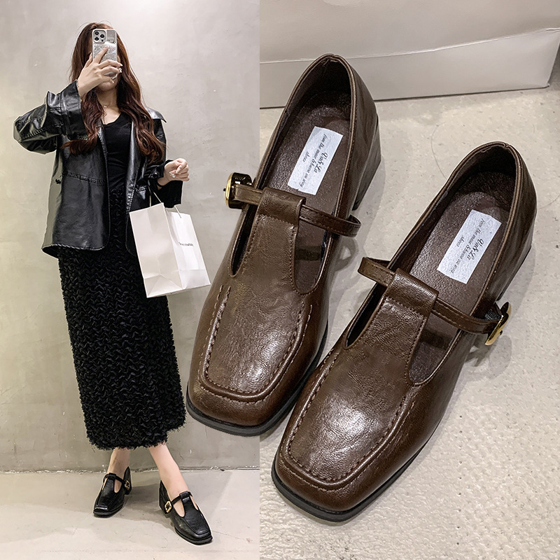 프랑스 레트로 스퀘어 발가락 청키 힐 신발 여성 봄과 가을 새로운 저녁 스타일 한국 스타일 요정 하이힐 메리 제인 작은 가죽 신발스토어 가기