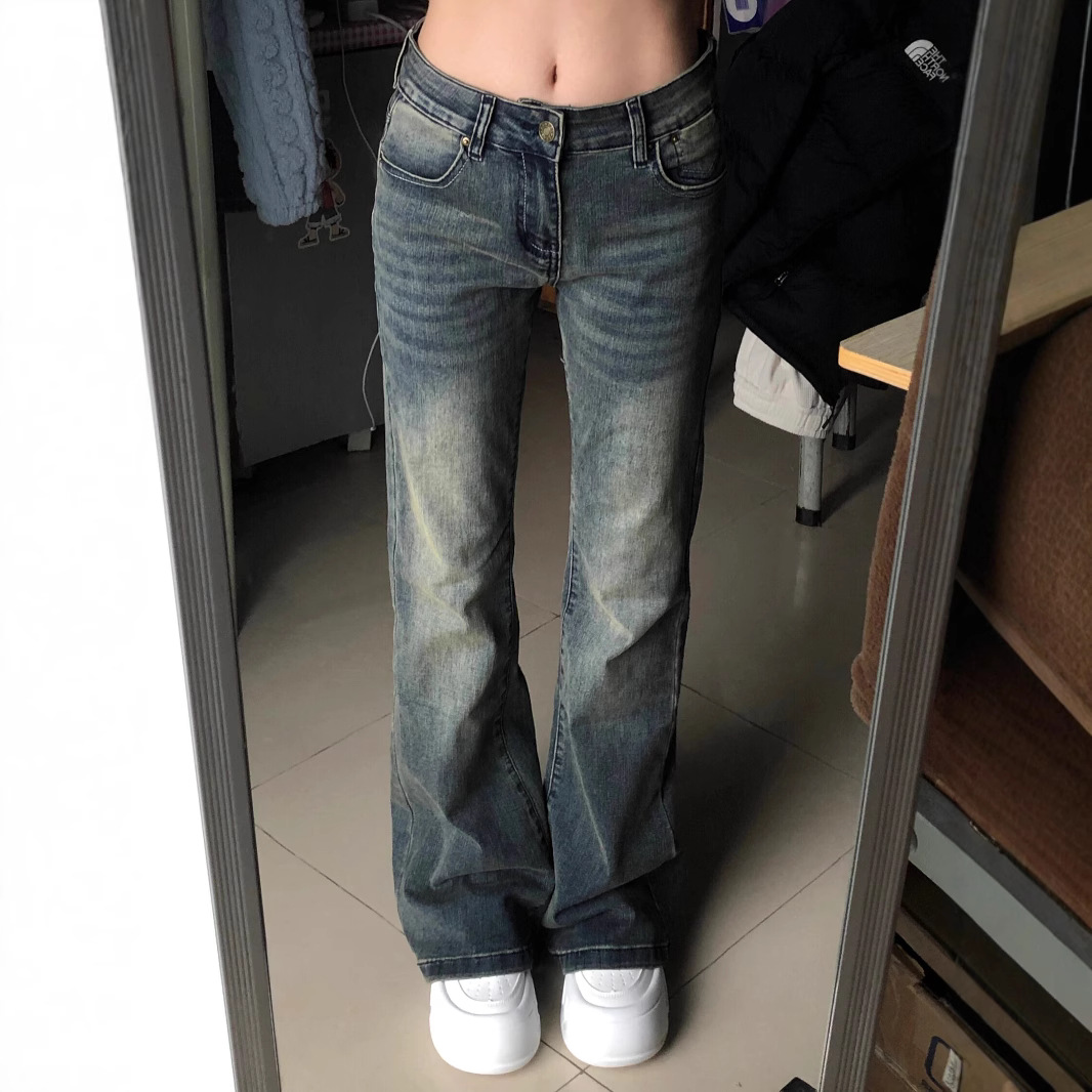 빈티지 블루 씻은 오래된 마이크로 플레어 청바지 여성의 가을과 겨울 새로운 미국 스타일의 낮은 허리 디자인 스트레치 말굽 바지스토어 가기