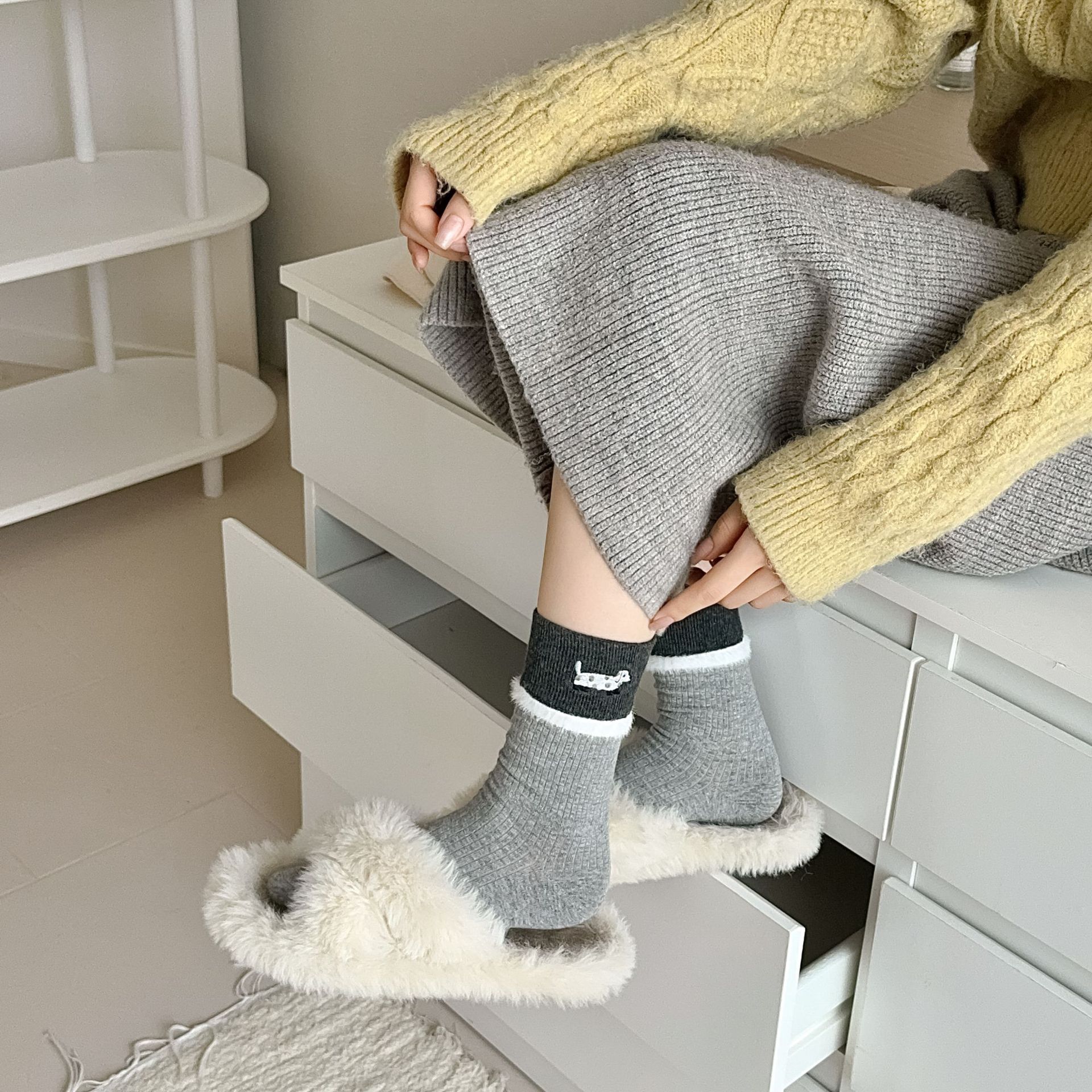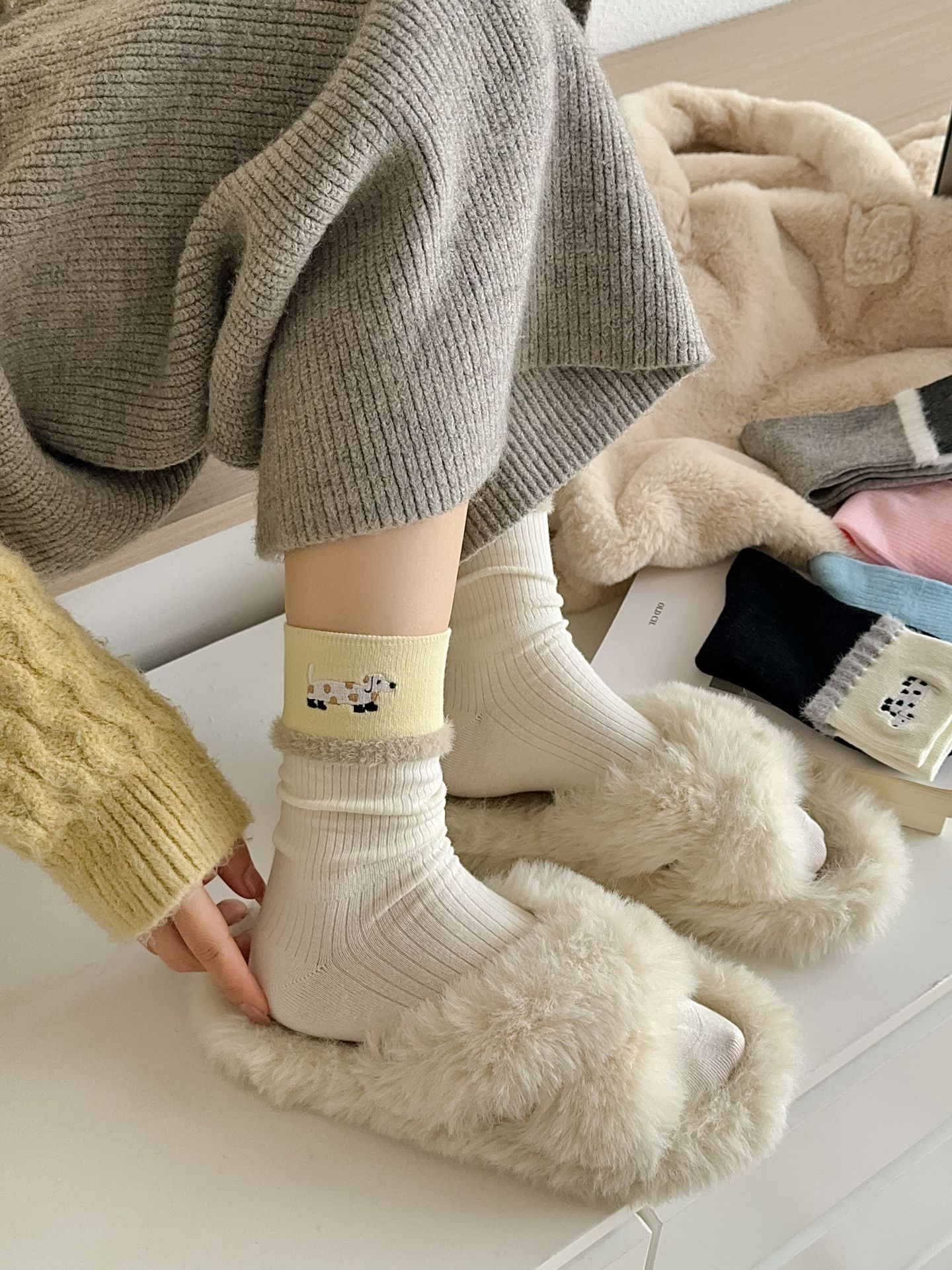 귀여운 만화 닥스 훈트 양말 여성용 중간 길이 양말 Ins 트렌디 한 봄과 가을 밍크 벨벳 컬러 블록 학생 그레이 스타킹스토어 가기