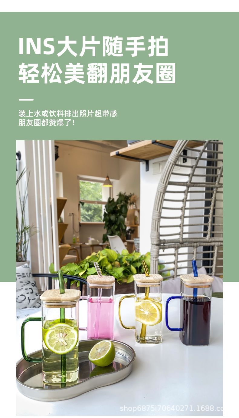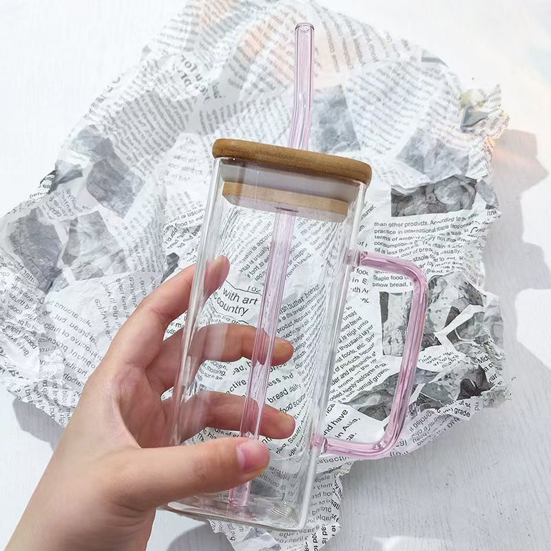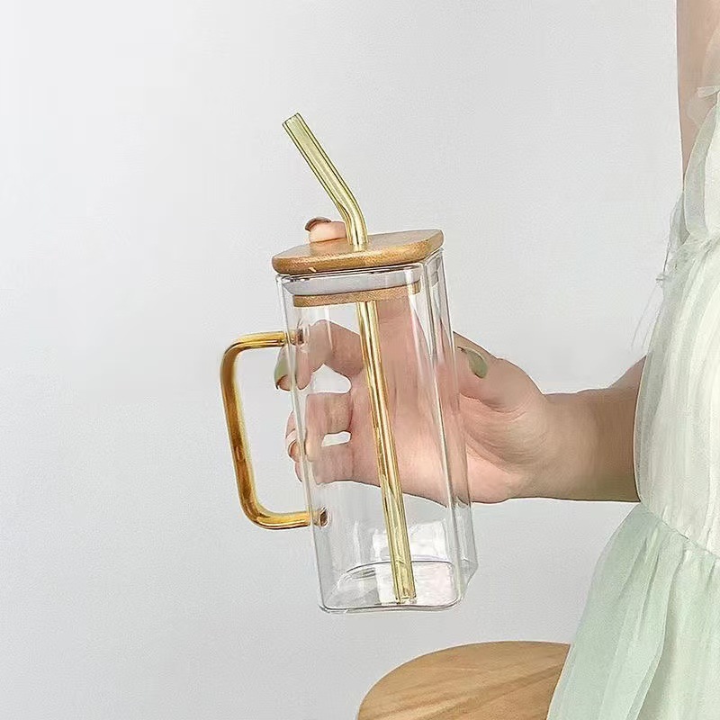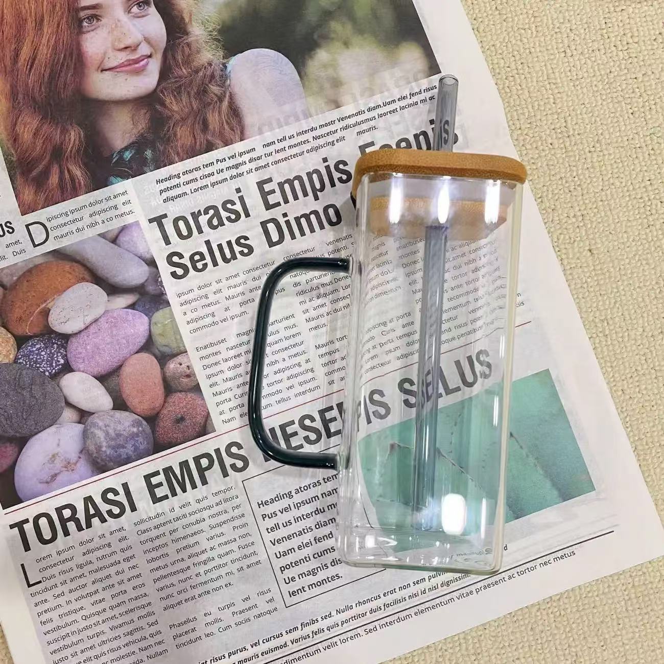 • 대나무 뚜껑과 빨대가 달린 투명한 사각 컵