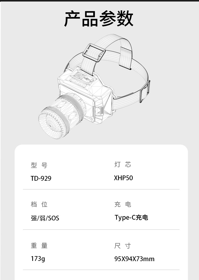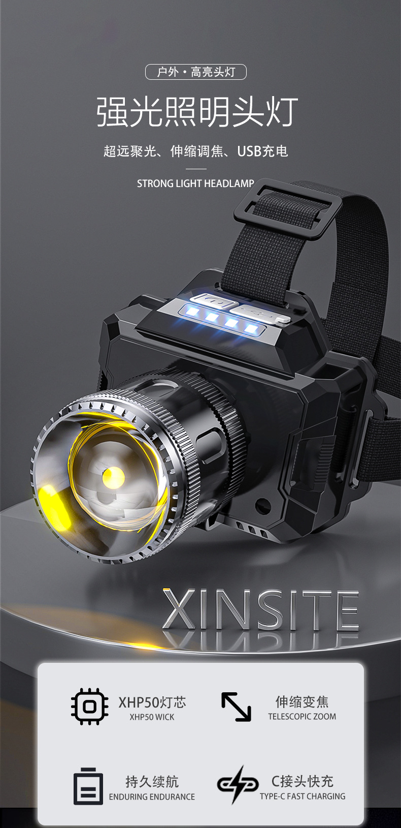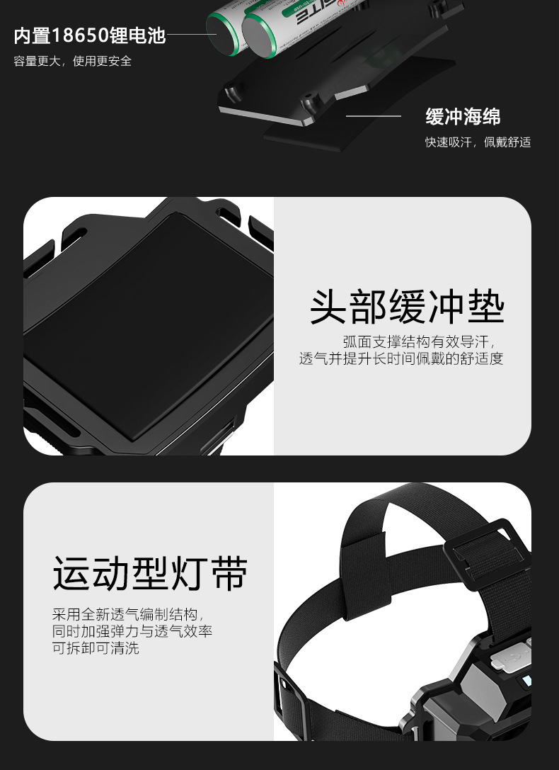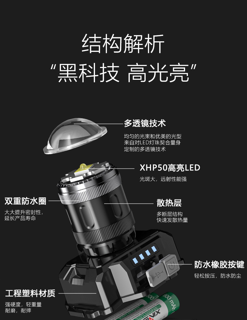 국경 간 야외 밝은 헤드 라이트 휴대용 충전 긴 지구력 방수 비오는 날 안개가 자욱한 밤 낚시 하이킹 야간 헤드 라이트