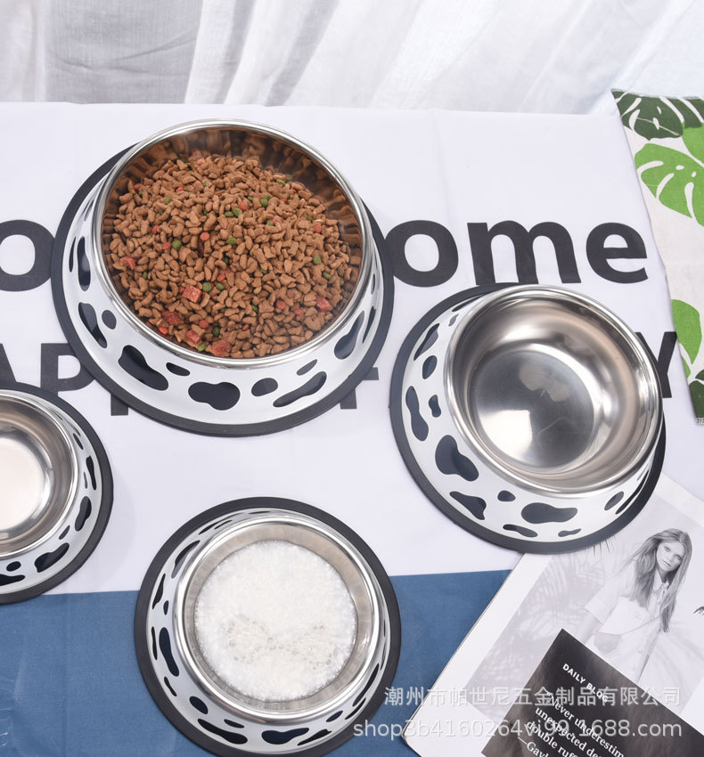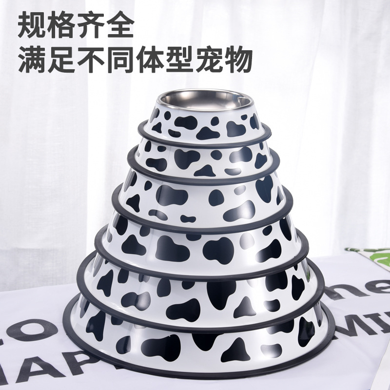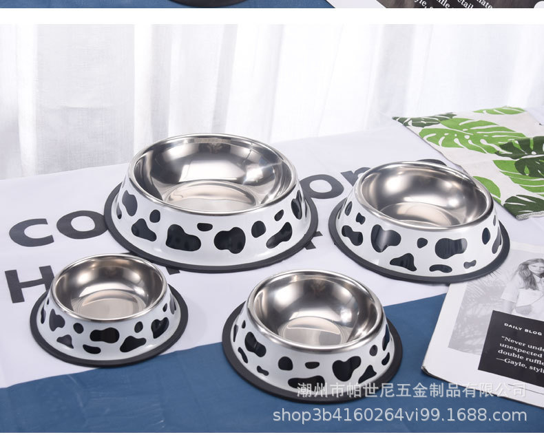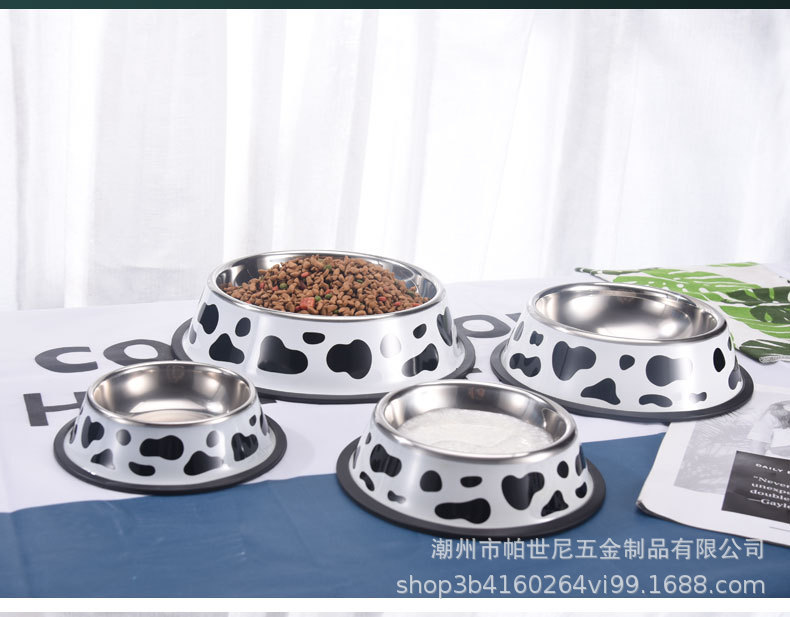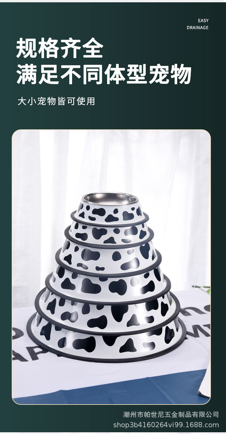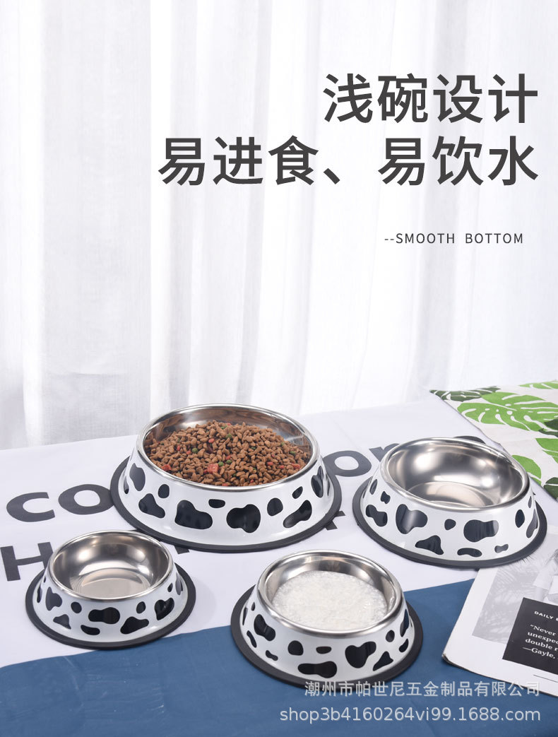 크로스보더 스테인리스 애완동물 그릇, 내구성, 미끄럼 방지, 고양이와 강아지 사료 그릇, 화이트 카우 디자인 애완동물 그릇, 넘어짐 방지 고양이 그릇, 강아지 그릇스토어 가기