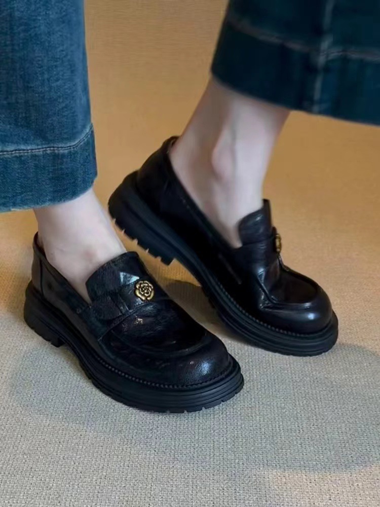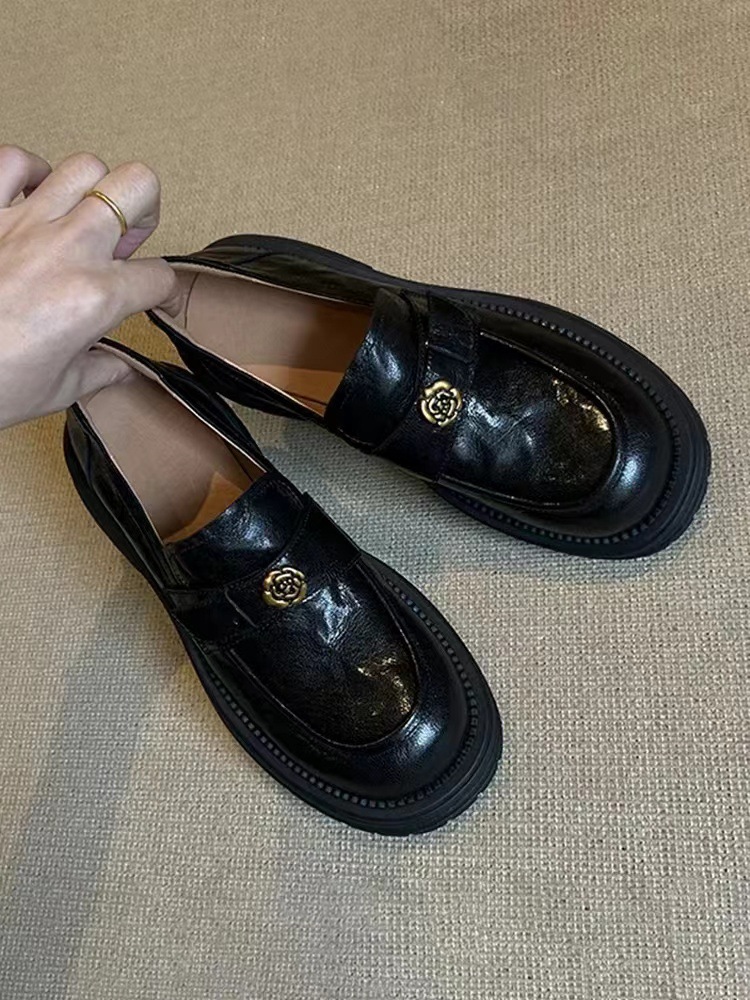 영국 스타일 동백 정품 가죽 두꺼운 바닥 작은 가죽 신발 여성의 2024 가을 라운드 발가락 빈티지 로퍼 저열 싱글 레이어 신발