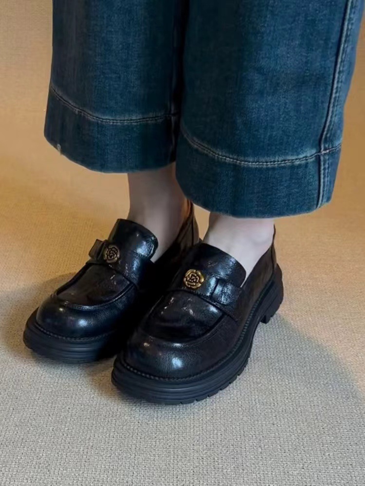 영국 스타일 동백 정품 가죽 두꺼운 바닥 작은 가죽 신발 여성의 2024 가을 라운드 발가락 빈티지 로퍼 저열 싱글 레이어 신발스토어 가기