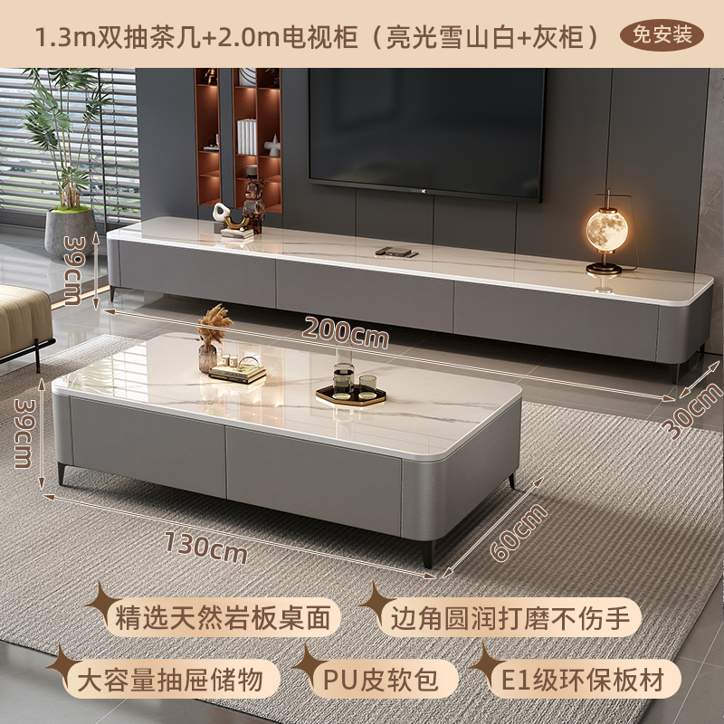 • [설치 불필요] 1.3m 더블 펌프스 커피 테이블 + 2.0m TV 캐비닛 (밝은 스노우 마운틴 화이트 + 그레이 캐비닛 소프트 백)