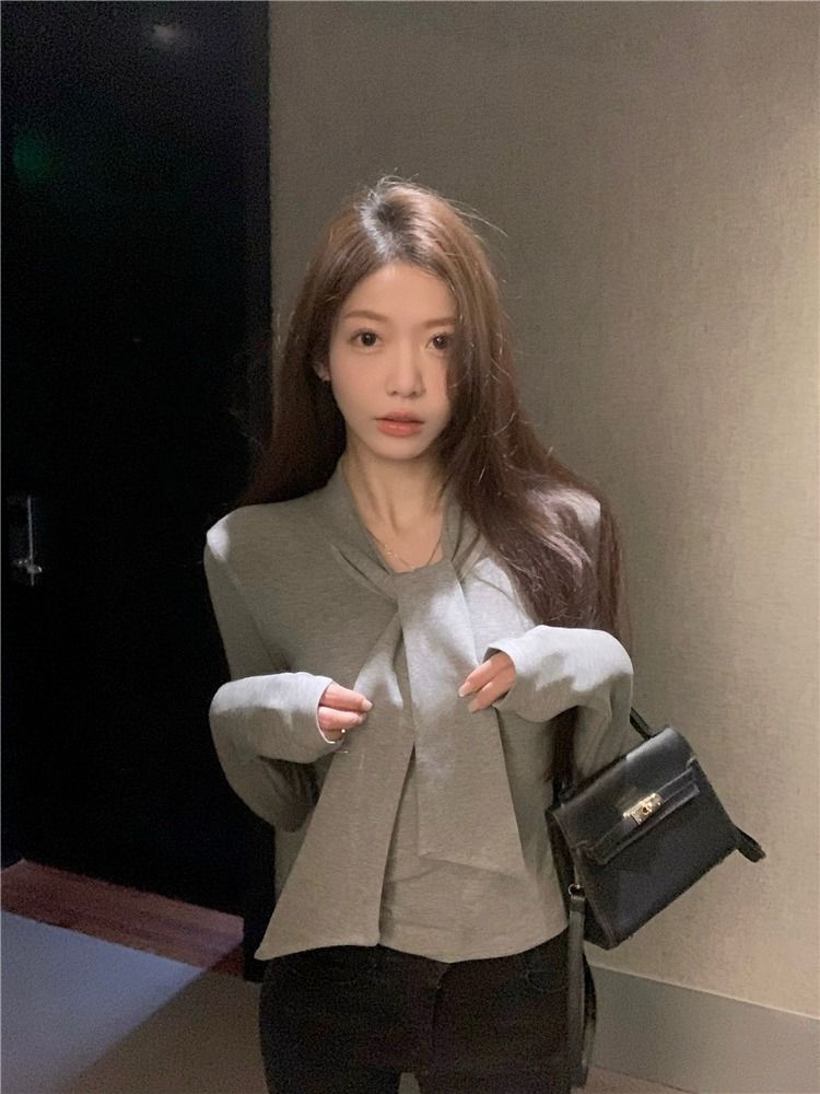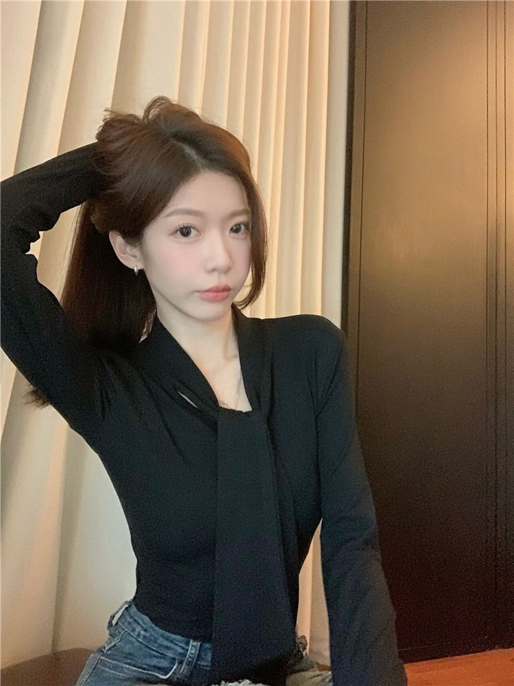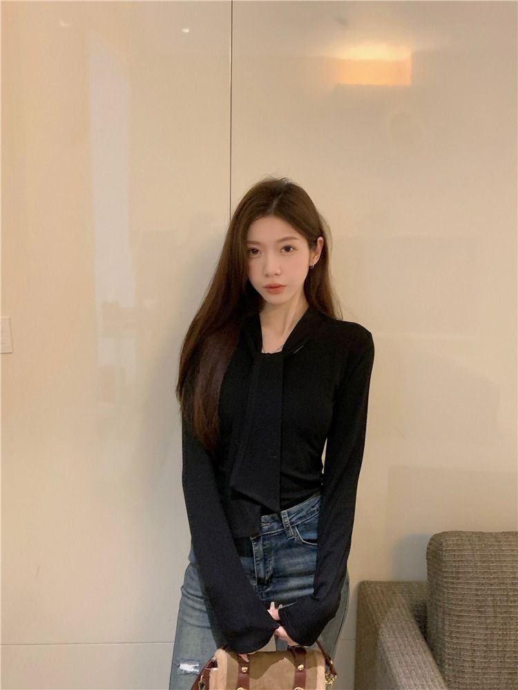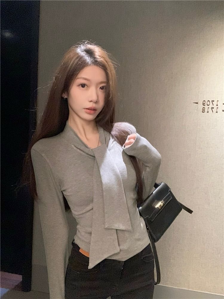 프랑스 스타일 레이스 업 티셔츠베이스 셔츠 여성용 가을과 겨울 디자인 센스 슬림 핏 타이트 핏 독특한 우아한 쇼트 탑스토어 가기