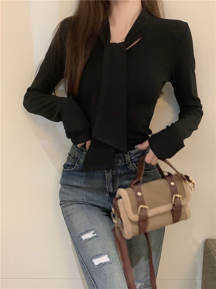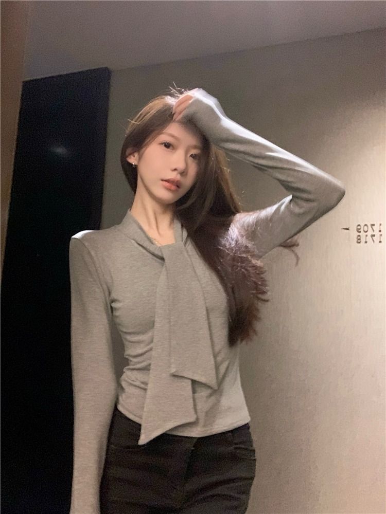 프랑스 스타일 레이스 업 티셔츠베이스 셔츠 여성용 가을과 겨울 디자인 센스 슬림 핏 타이트 핏 독특한 우아한 쇼트 탑