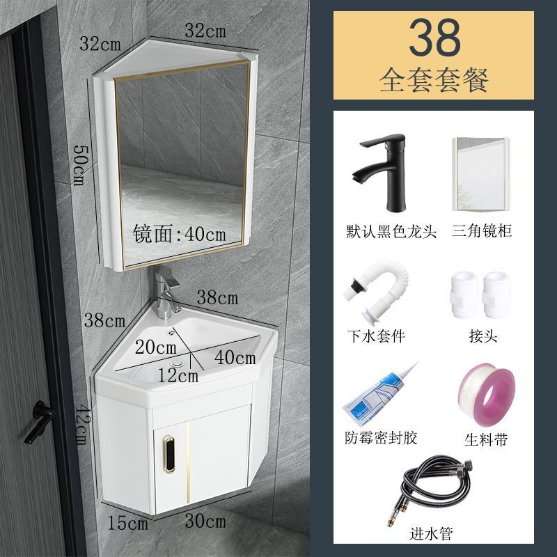 • White-3838 세면대 캐비닛 + 배수구 + 수도꼭지 + 삼각형 거울 캐비닛