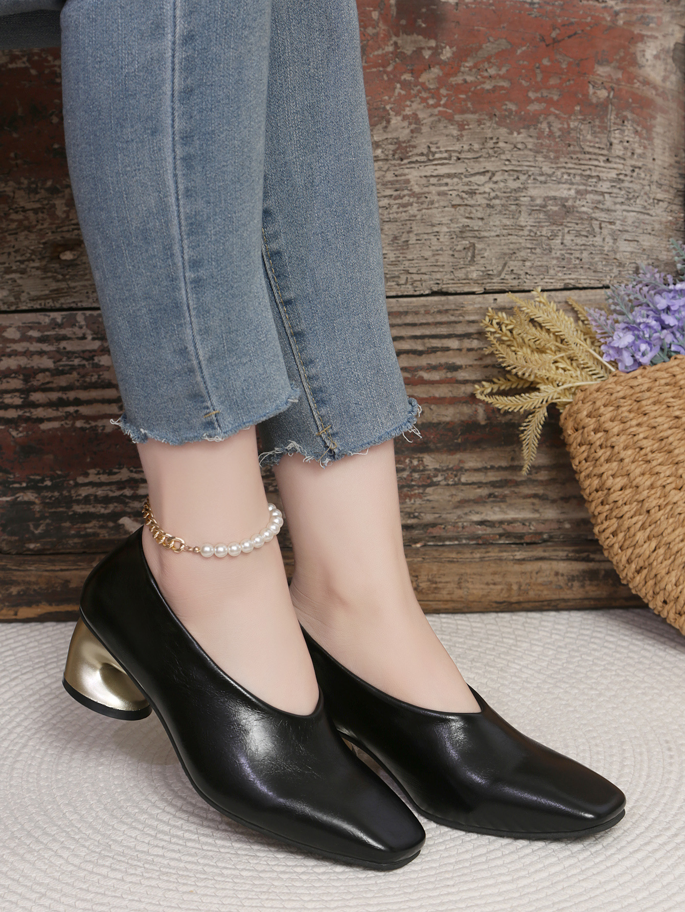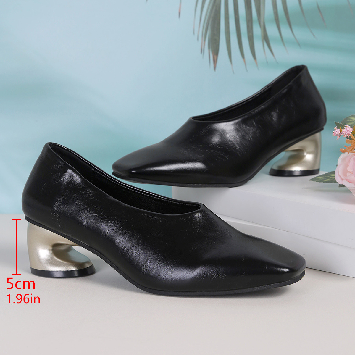 여성을위한 크로스 보더 대형 특수 모양의 힐 싱글 슈즈 2025 봄, 가을 새로운 유럽과 미국 스타일의 세련된 스퀘어 토 다용도 두꺼운 힐 작은 가죽 신발스토어 가기