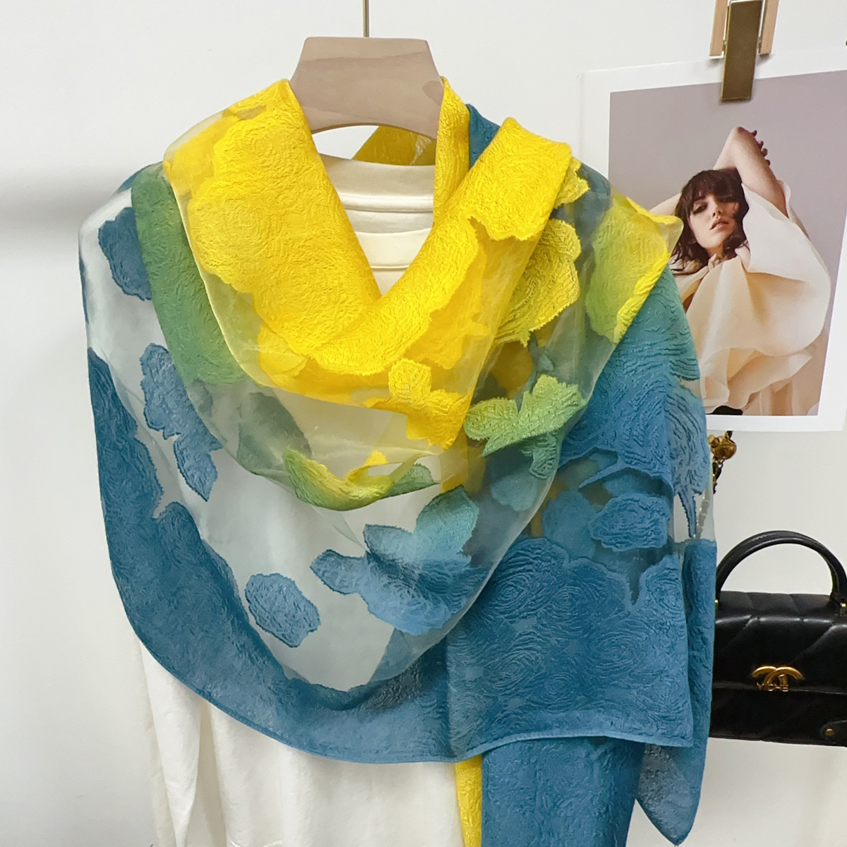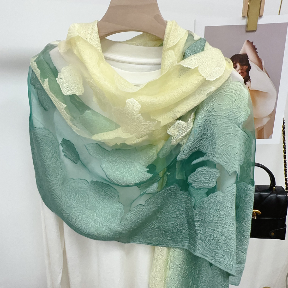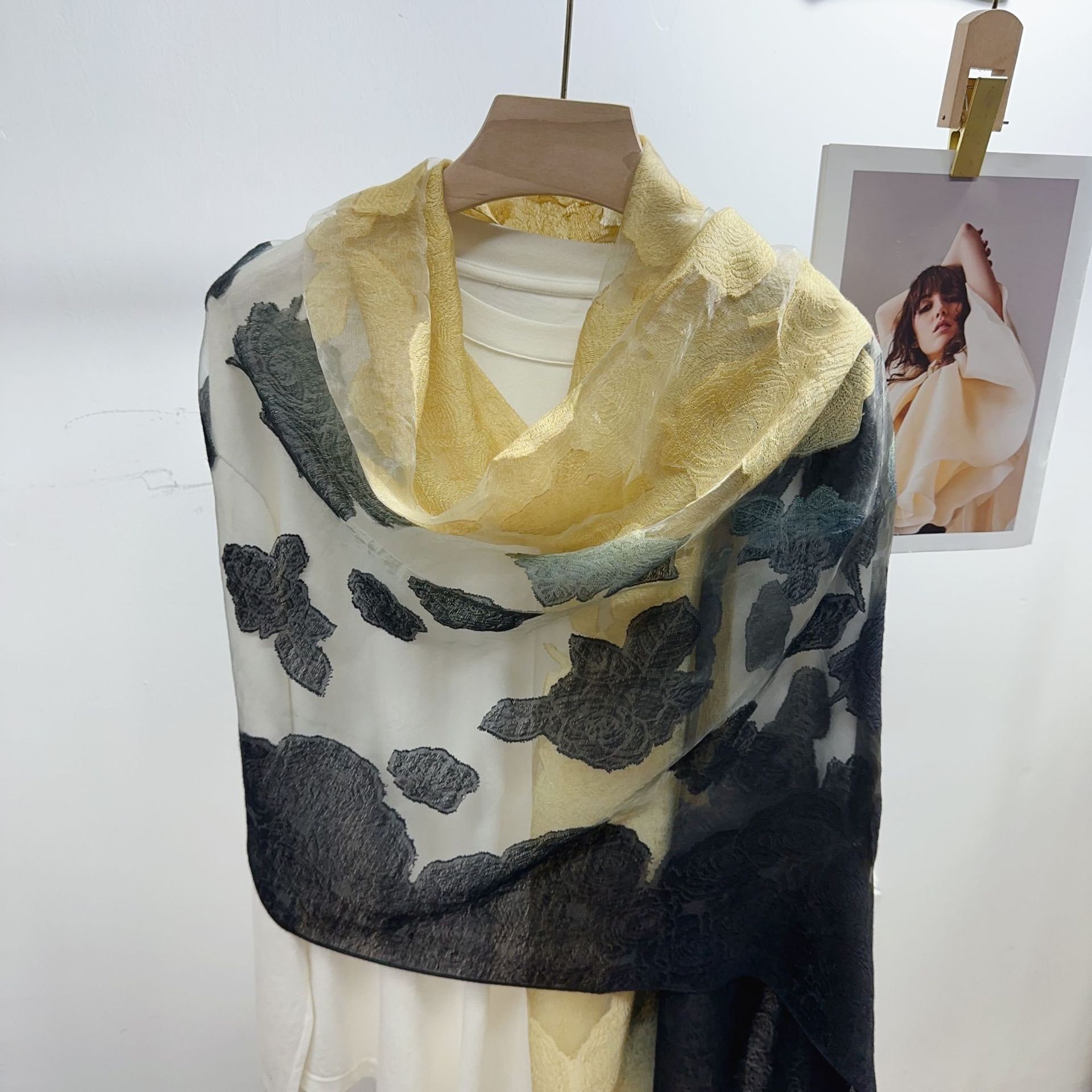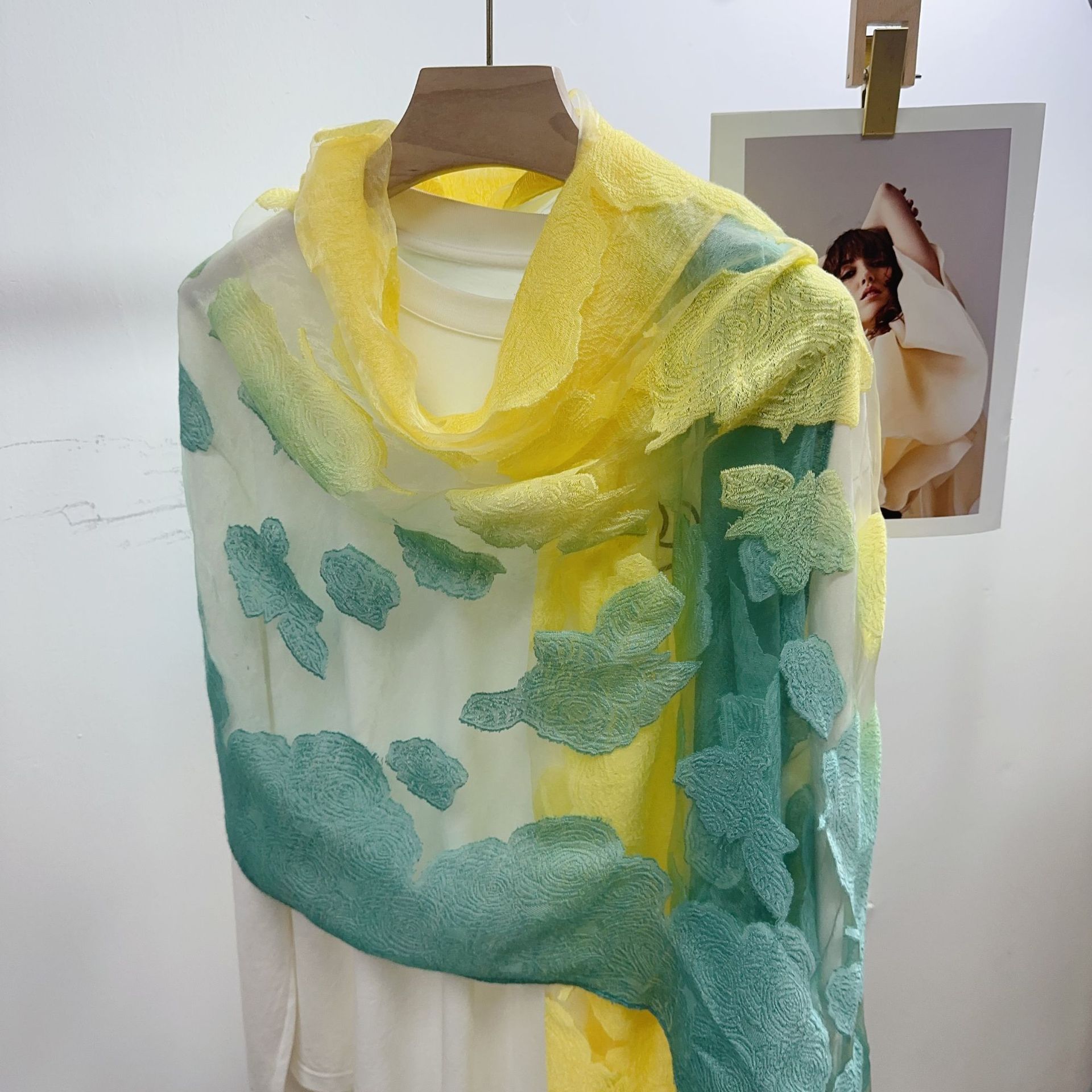 국경을 넘나 드는 새 스카프 여성의 봄과 가을 한국식 오간자 장미 컷 꽃 그라디언트 긴 스카프 외부 목도리