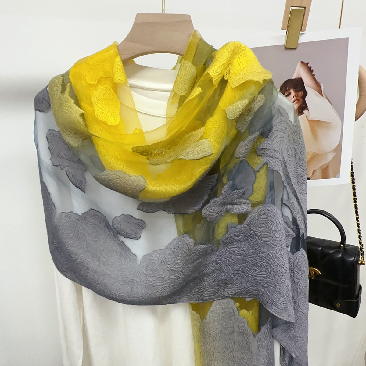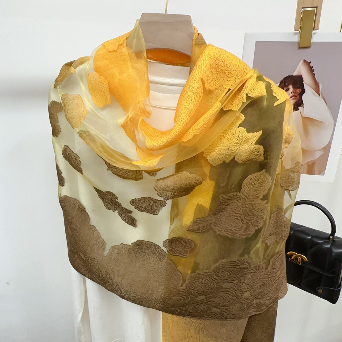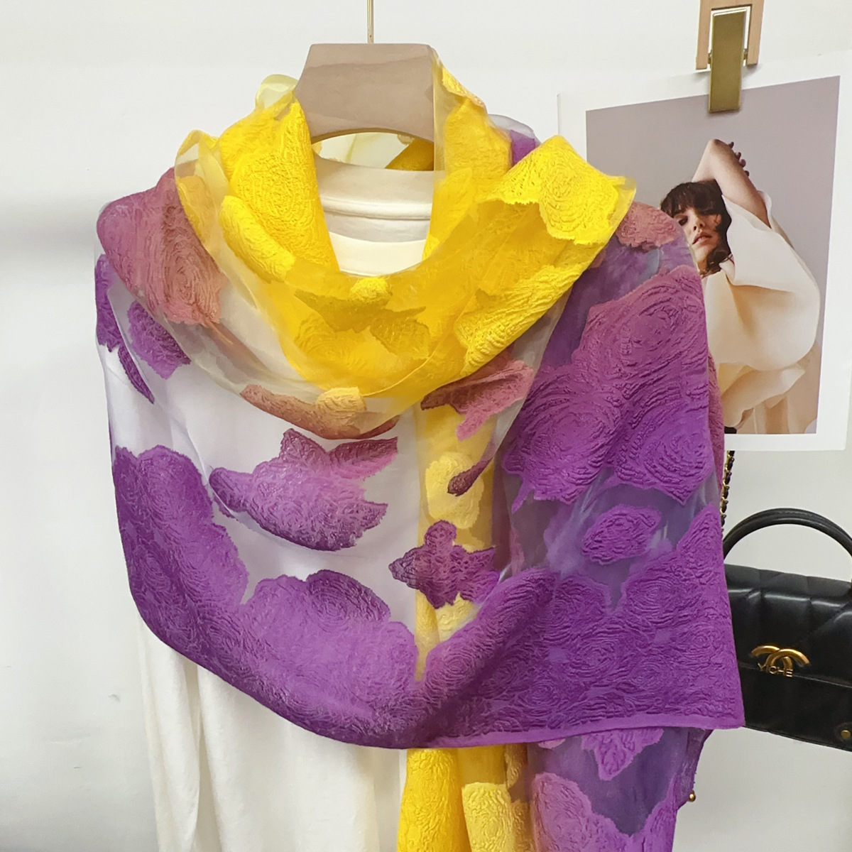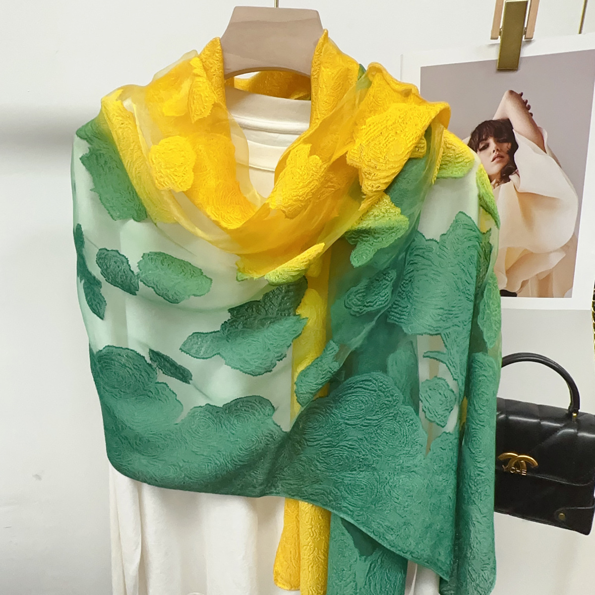 국경을 넘나 드는 새 스카프 여성의 봄과 가을 한국식 오간자 장미 컷 꽃 그라디언트 긴 스카프 외부 목도리