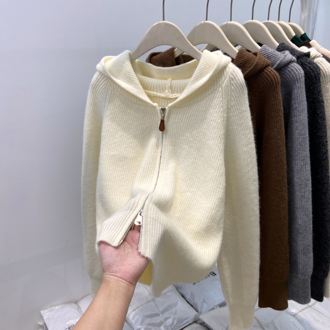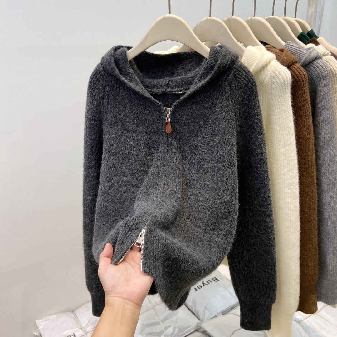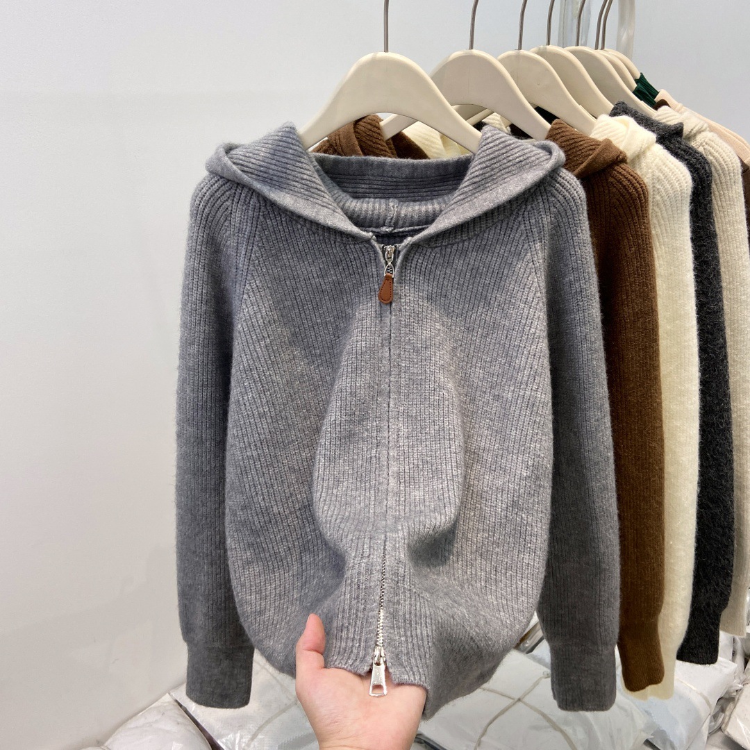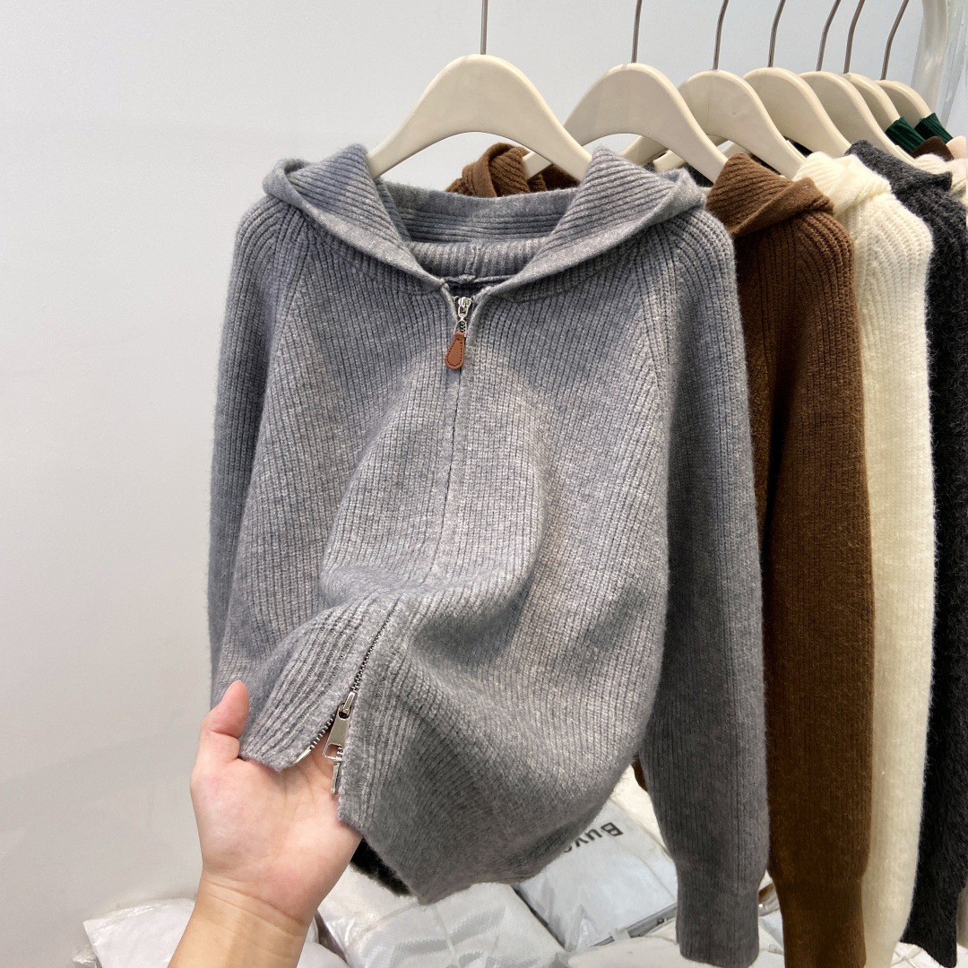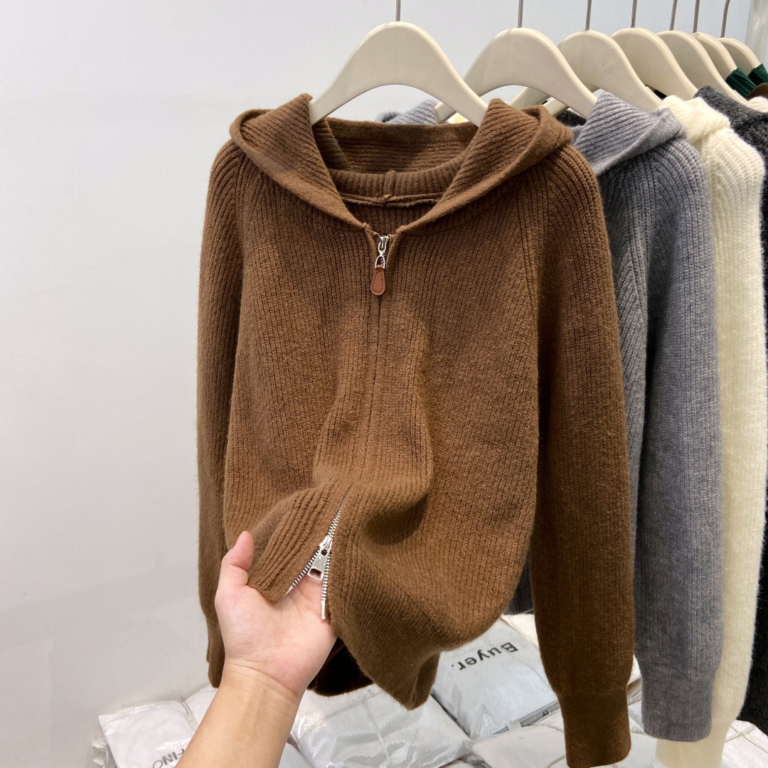 가을 겨울 더블 지퍼 니트 스웨터 재킷 여성용 2025 유행 후드 디자인 나이 감소 효과 작은 사이즈 카디건스토어 가기