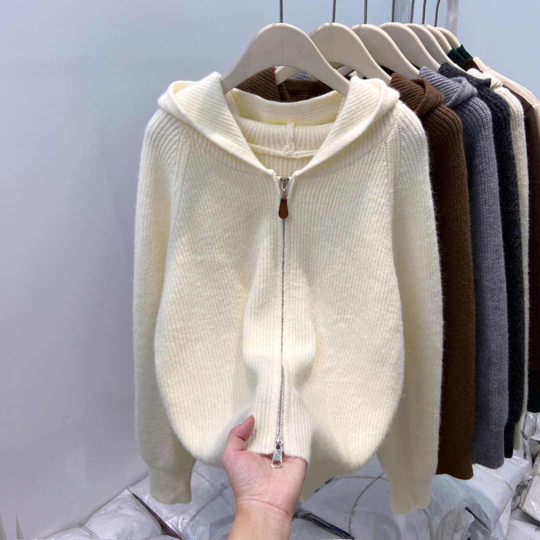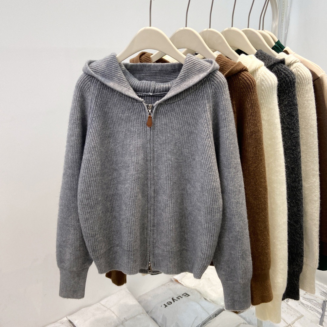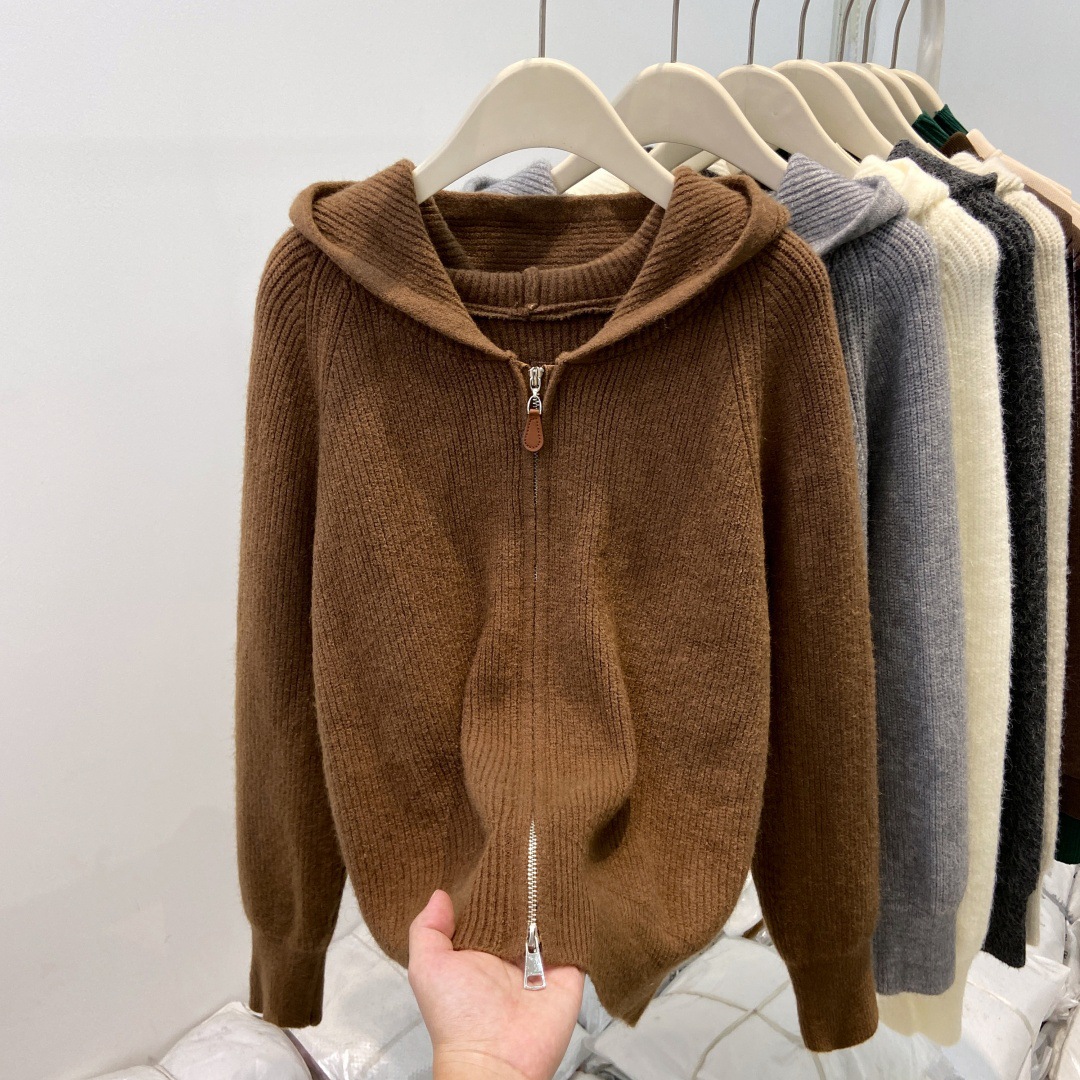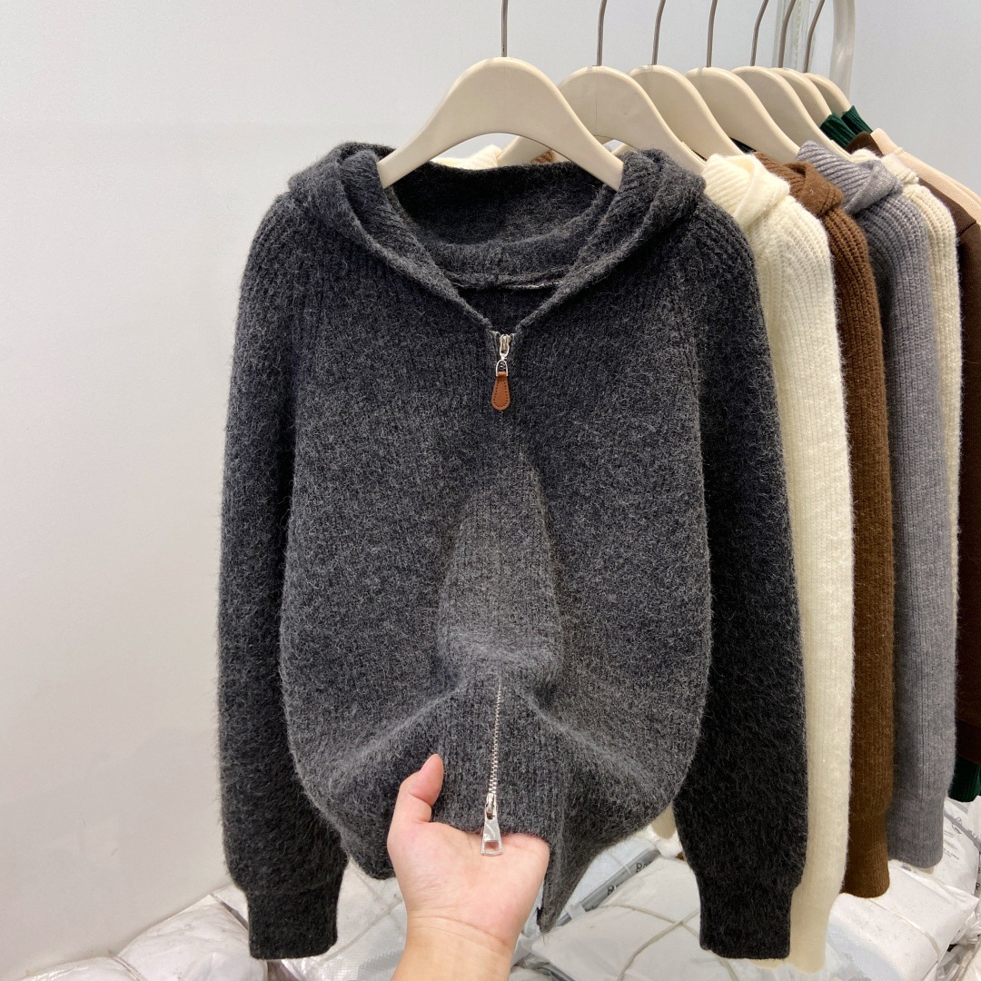 가을 겨울 더블 지퍼 니트 스웨터 재킷 여성용 2025 유행 후드 디자인 나이 감소 효과 작은 사이즈 카디건스토어 가기