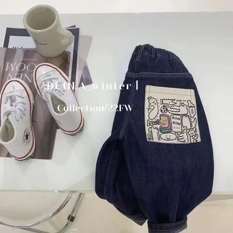 소년 기모 두꺼운 청바지 소프트 2024 새로운 한국 소녀 아기 원피스 벨벳 캐주얼 트렌디 팬츠스토어 가기
