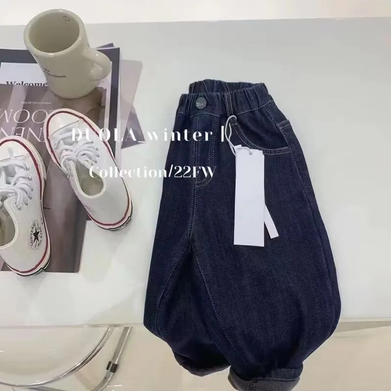 소년 기모 두꺼운 청바지 소프트 2024 새로운 한국 소녀 아기 원피스 벨벳 캐주얼 트렌디 팬츠